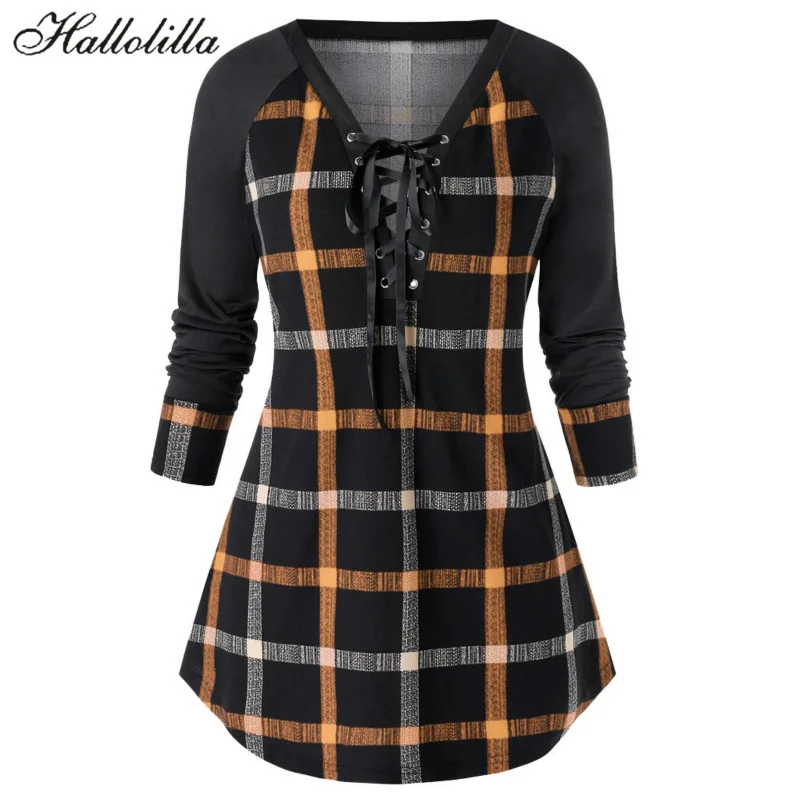 Блузка женская клетчатая на шнуровке, модный Повседневный пуловер с...
