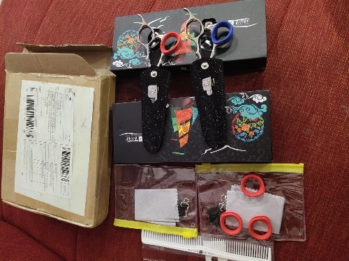 товар соответствует заявленому описанию. В руке сидит отлично, срез делает ровный. Концы ножниц ровные, заточка классная. В набор идёт ключ, салфетка и расческа. Есть резиновые кольца для более тонких пальцев!