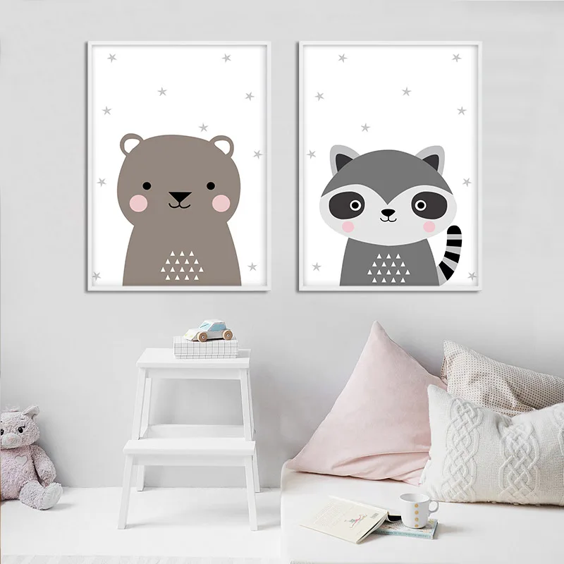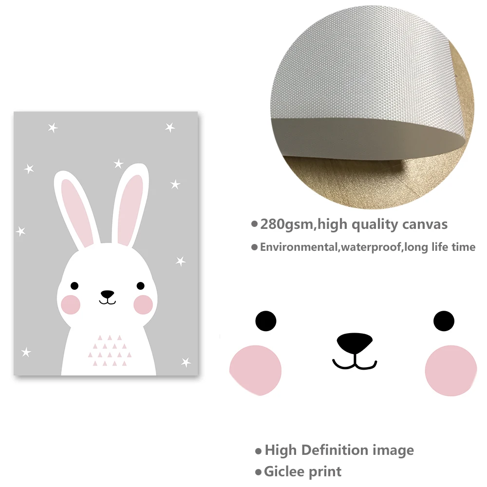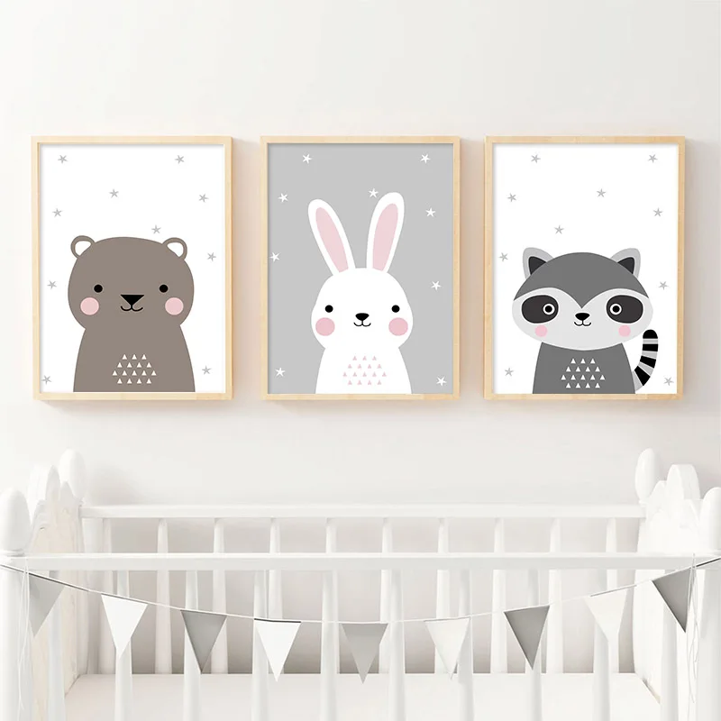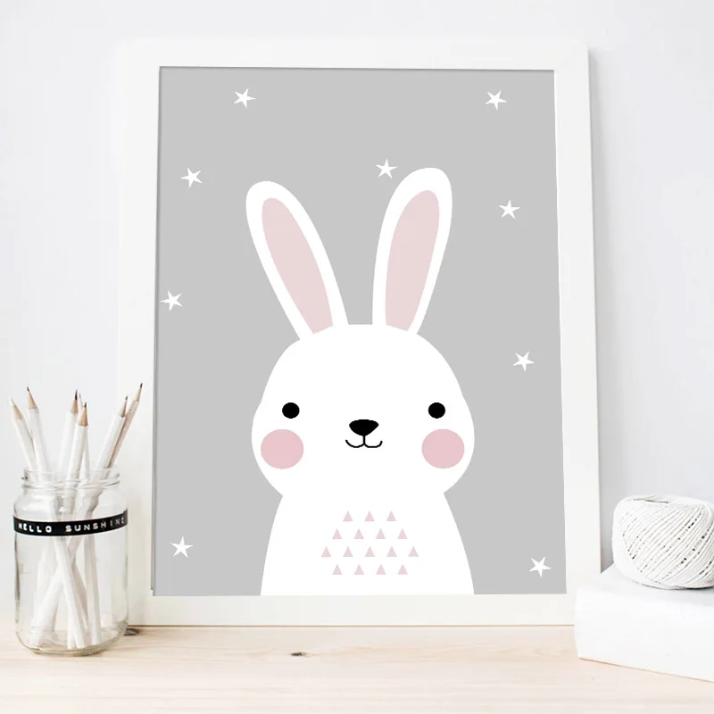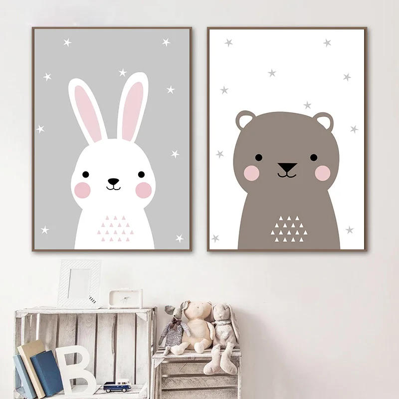 Картина на холсте с мультяшными животными, зайчик, медведь, Детская фотография на стену, детское украшение в скандинавском стиле, картина, декор для детской спальни