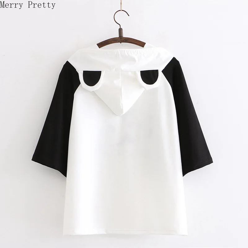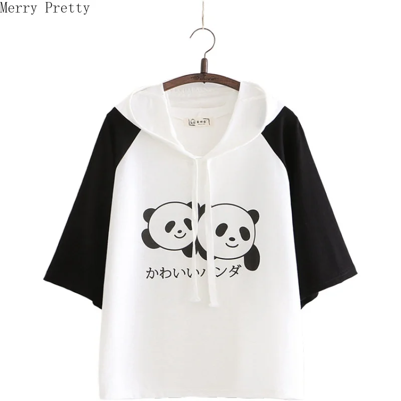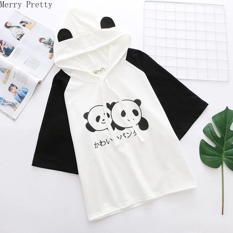Женские Забавные футболки с мультяшным принтом панды с ушками на капюшоне 2020 летняя хлопковая футболка с капюшоном повседневные милые футболки с коротким рукавом