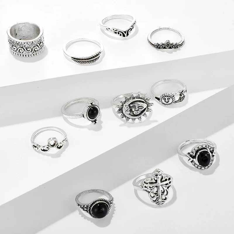 Набор женских винтажных колец Tocona, 11 шт., с черным кристаллом, луной, солнцем, суставами сердца, 14420
