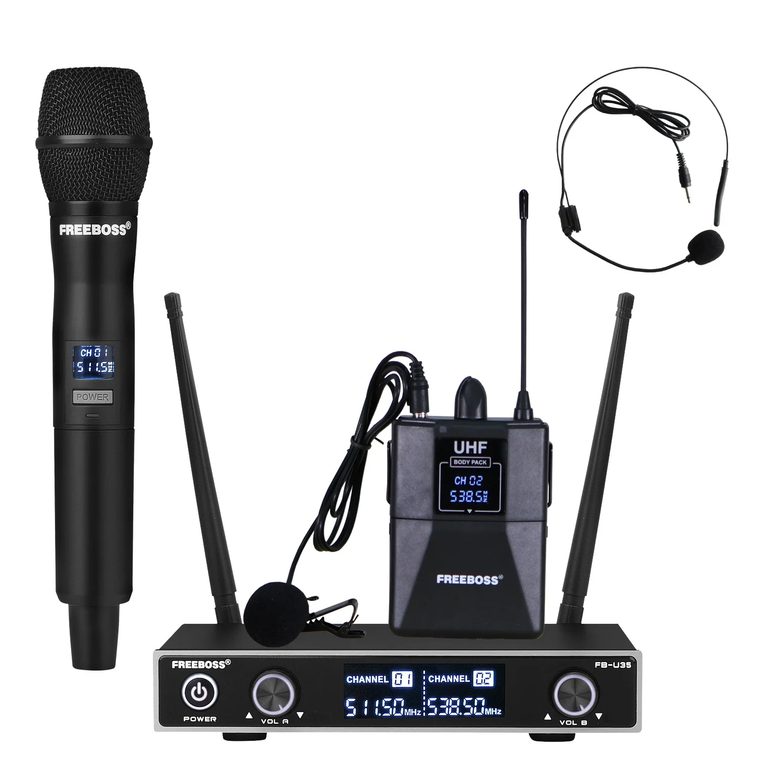 Freeboss FB-U35H двухполосная UHF Беспроводная микрофонная система с фиксированной частотой с ручным + отворотом + гарнитура для караоке-микрофона