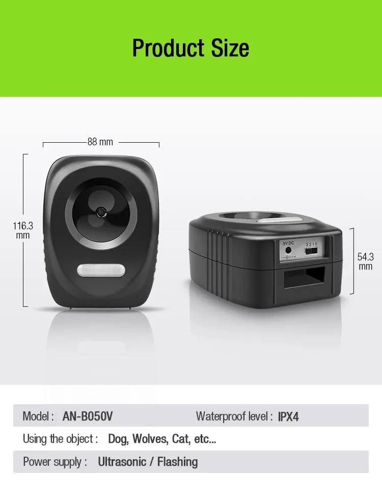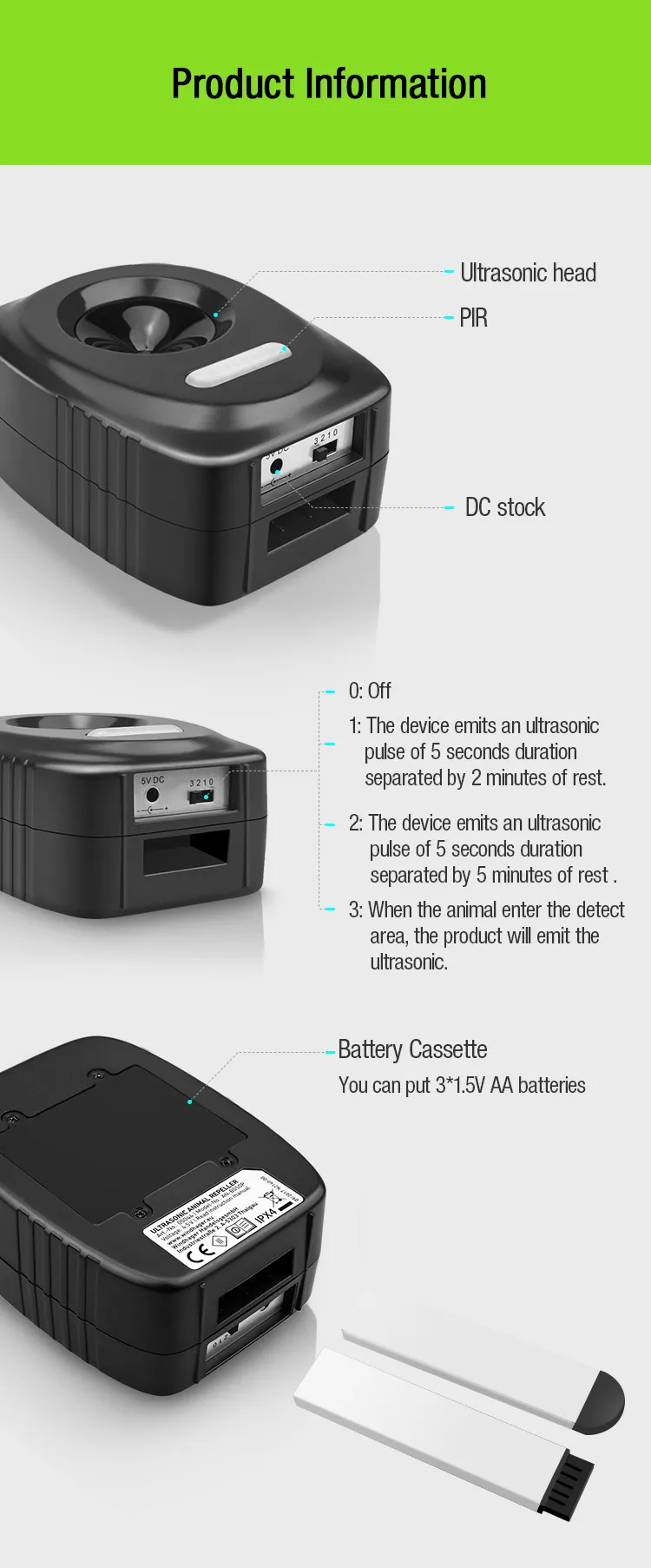 Активный Отпугиватель котов:1. Сильный ультразвуковой сигнал пугает животных. Животные избегают площади из-за его неприятного ультразвукового звука. Животные не могут привыкнуть к звуку, а отталкивающий эффект сильнее.