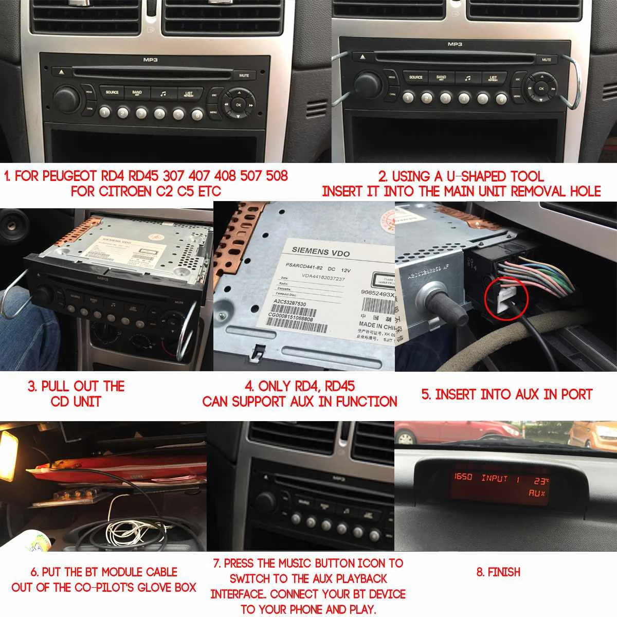 Установка:Красный силовой кабель, подключенный к 12V +Черный силовой кабель, подключенный к 12V-Подключите к разъему cd-плеера (пожалуйста, подтвердите соответствующую розетку), мобильный телефон подключен к модулю bluetooth, выбор источника аудио aux, вы можете воспроизводить музыку на мобильный телефон.Параметры1. Название: адаптер аудиокабеля2. Модель: E167473. Цвет: черный4. Материал: АБС-пластик5. Расстояние передатчика: 15 м6. Частотная характеристика: 20 Гц-20 кГц7. Диапазон частот: 2,402-2,480 ГГц8. Скорость искажений: ≤ 1%9. Ток: 20 мА · ч10. Название bluetooth: JieRi-BT 590811. Версия bluetooth: 5,012. Напряжение продукта: 12 В13. Длина микрофона: 150 см14. Применимые модели:Для Peugeot 307 408 508 для Citroen для Sega для Triumph C2 C5 RD45 RD4Для Blaupunkt/VDO/Bosch RD4.C3 2005 +Для Blaupunkt/VDO/Bosch RD4 C4 2005 +Для Blaupunkt/VDO/Bosch RD4 C5 2004 +Для Blaupunkt/VDO/Bosch RD4.C6 2005 +Для Blaupunkt/VDO/Bosch rd4.для Citroen C8 2004Для Blaupunkt/VDO/Bosch rd4.для Citroen Berlingo 2005 +Для Blaupunkt/VDO/Bosch rd4.для Citroen Jumpy 2007 + дляДля Blaupunkt/VDO/Bosch rd4.для Citroen Synergie 2005 +Для Blaupunkt/VDO/Bosch rd4.для Peugeot Expert 2007 +Для Blaupunkt/VDO/Bosch rd4.для Peugeot 207 2006 +Для Blaupunkt/VDO/Bosch rd4.для Peugeot 307 2005 +Для Blaupunkt/VDO/Bosch rd4.для Peugeot 307SW 2005 +Для Blaupunkt/VDO/Bosch rd4.для Peugeot 307CC 2004 +Для Blaupunkt/VDO/Bosch rd4.для Peugeot 308 2007 +Для Blaupunkt/VDO/Bosch rd4.для Peugeot 407 2005 +Для Blaupunkt/VDO/Bosch rd4.для Peugeot 407SW 2005 +Для Blaupunkt/VDO/Bosch rd4.для Peugeot 607 2005 +Для Blaupunkt/VDO/Bosch rd4.для Peugeot 807 2005 +Для Blaupunkt/VDO/Bosch rd4.для Peugeot 1007 2005 +Для Blaupunkt/VDO/Bosch rd4.для Peugeot 4007 2007 +