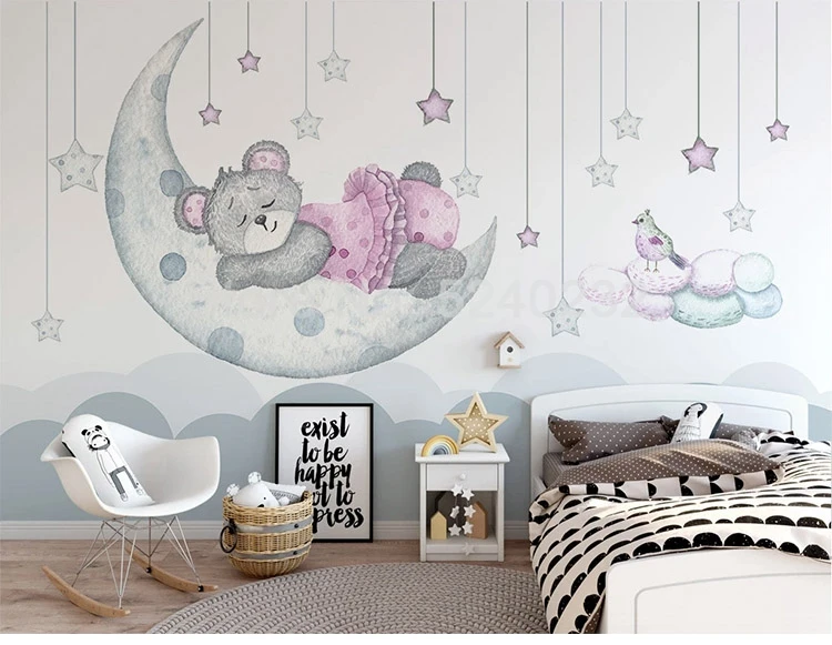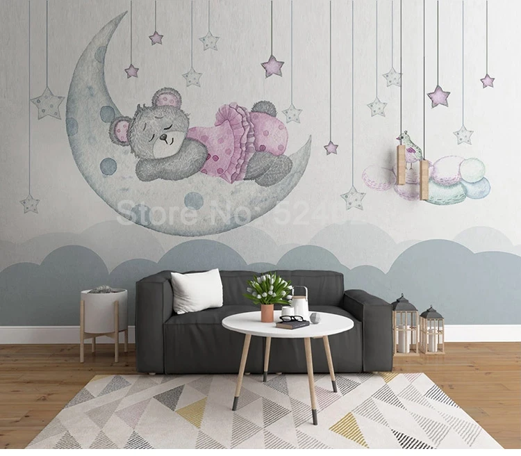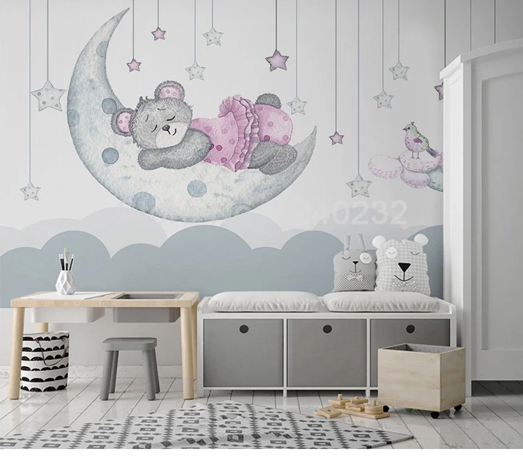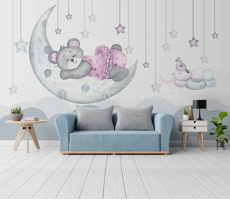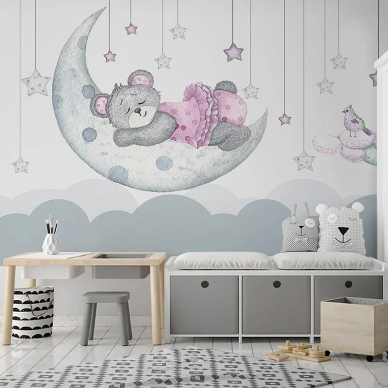 Фотообои на заказ с изображением Луны, звезд, розового медведя, фотообои для детского сада, детской комнаты, девушки, спальни