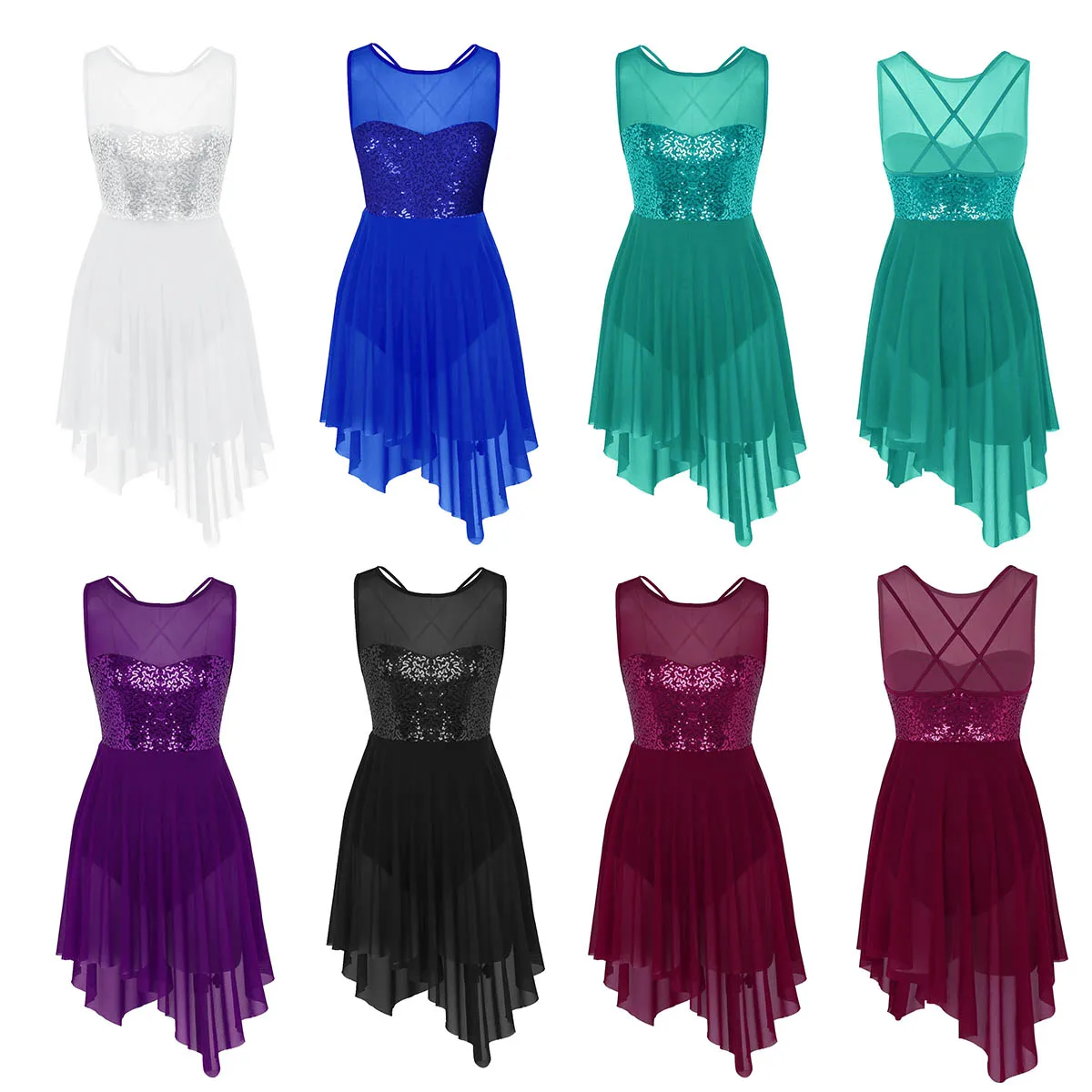 Женское Сетчатое платье для фигурного катания, асимметричное балетное платье с блестящими блестками, гимнастическое трико для взрослых, костюмы для лирических танцев для выступлений