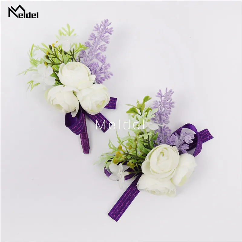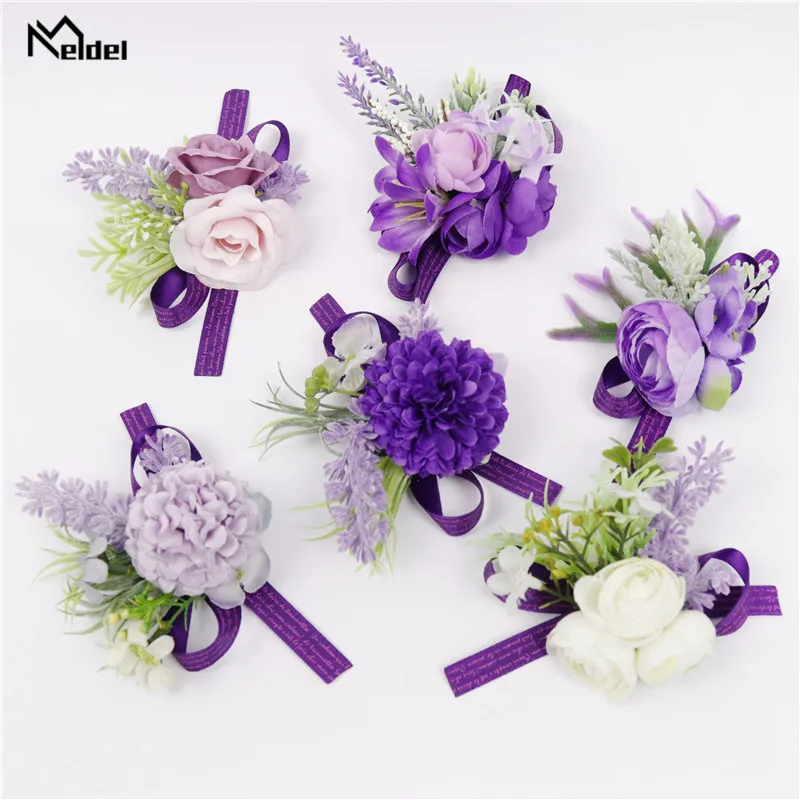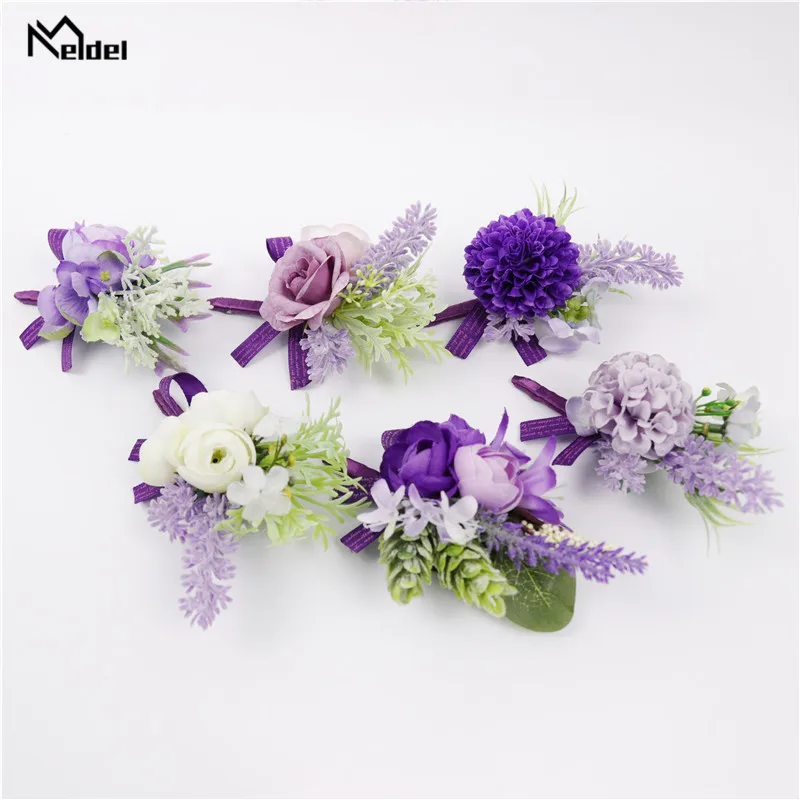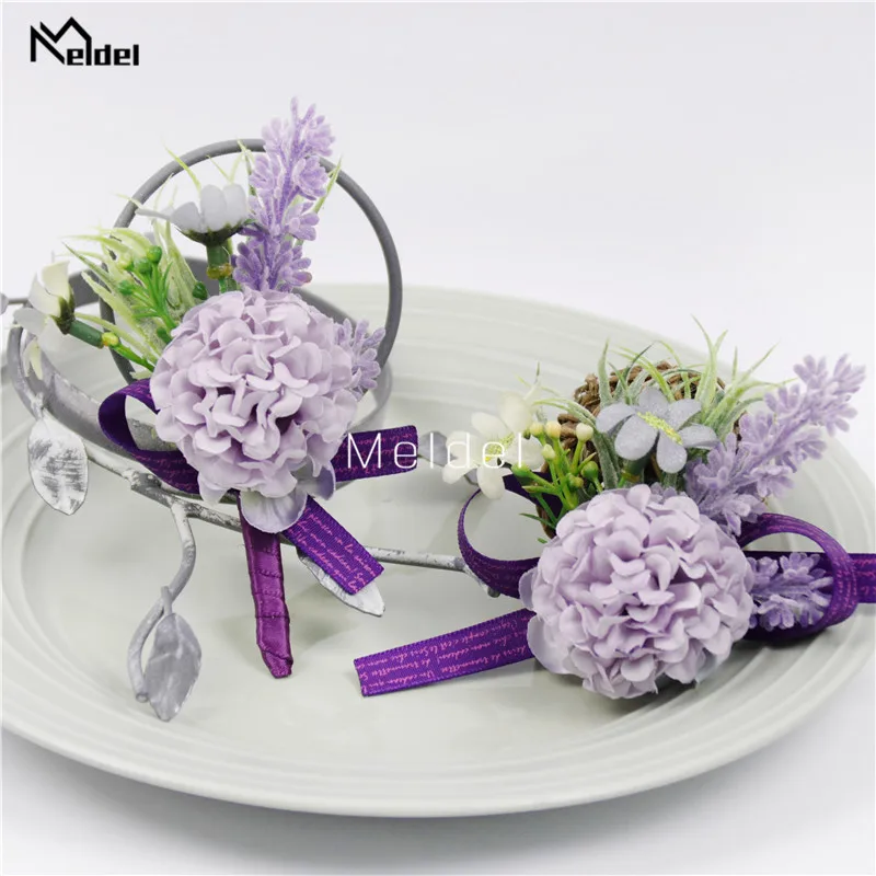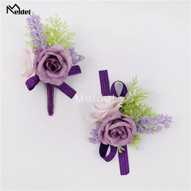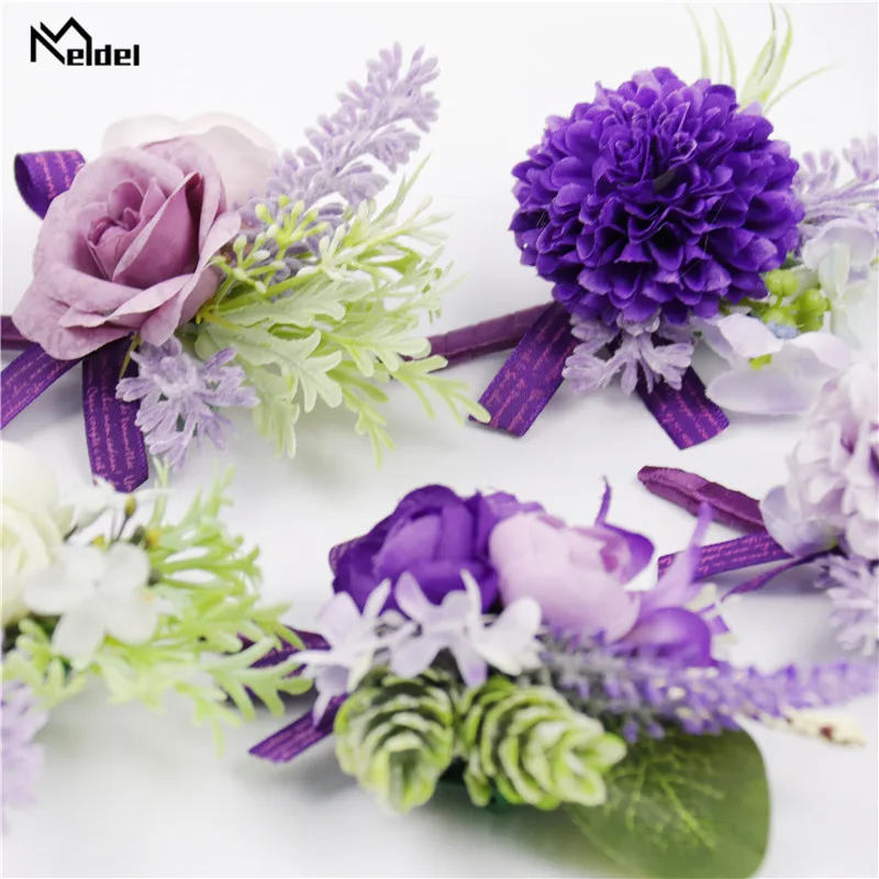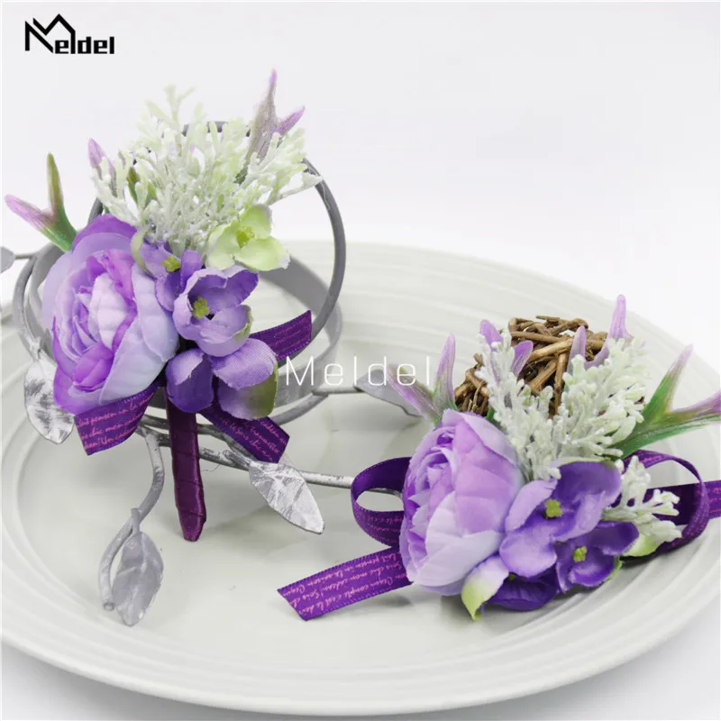 Meldel, фиолетовый браслет-корсаж на запястье, цветы для подружек невесты, Белый Свадебный корсаж, бутоньерка, костюм для жениха, свадебные аксессуары