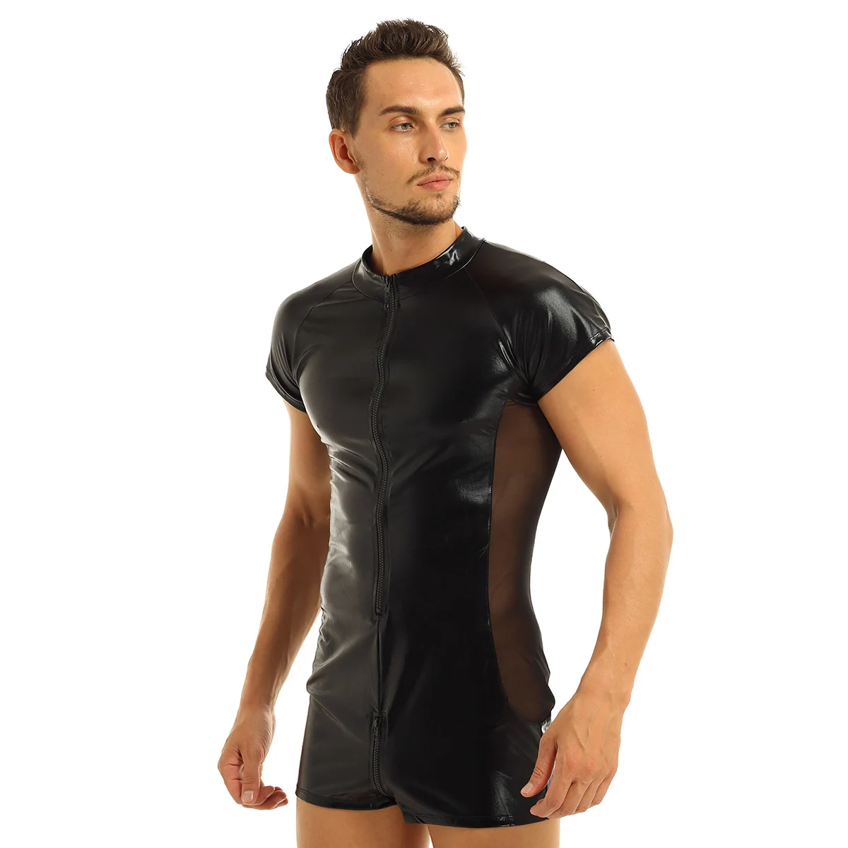 Мужской комбинезон из лакированной кожи Wetlook, сексуальный прозрачный сетчатый комбинезон на молнии спереди, мужской латексный комбинезон для геев, мужское трико, нижнее белье