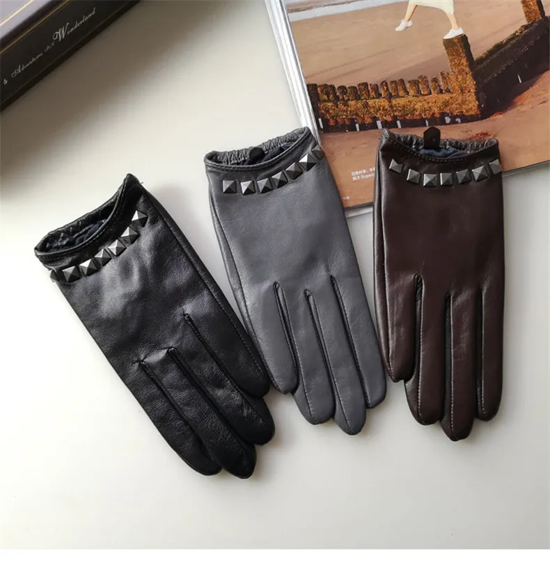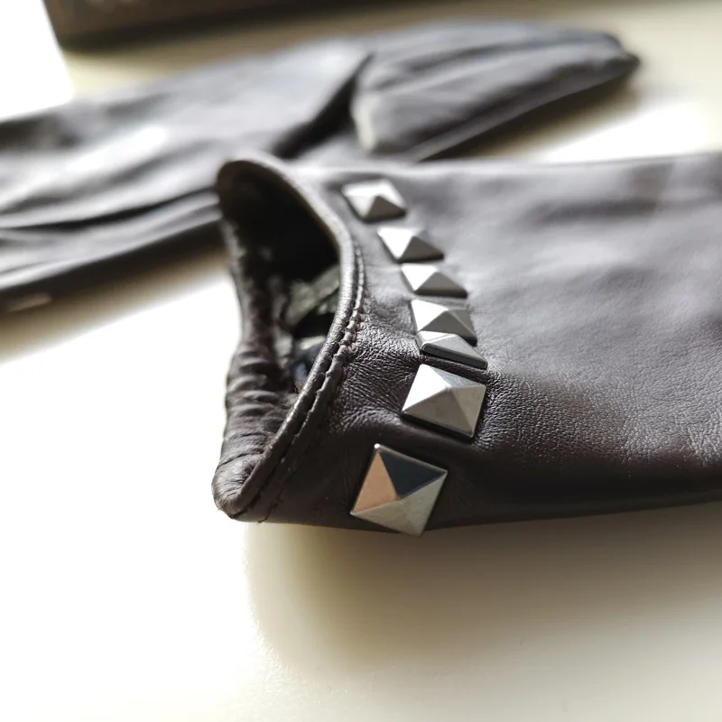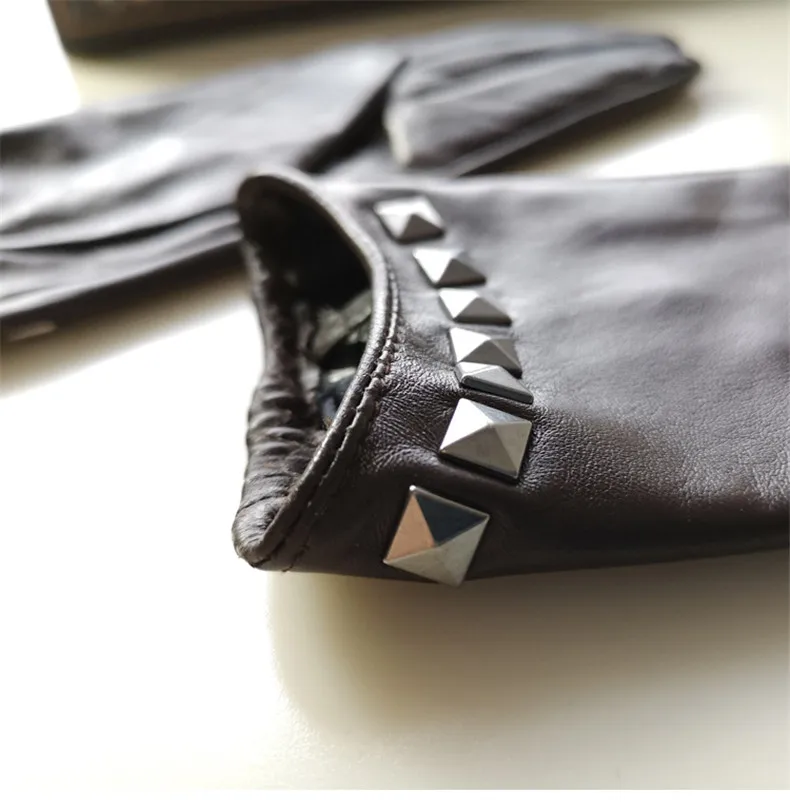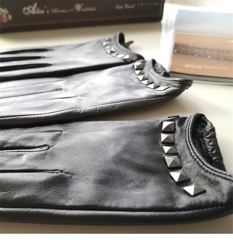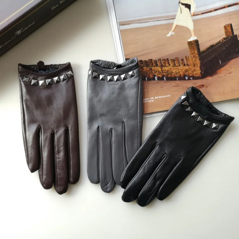 Перчатки из натуральной кожи с шелковистой подкладкой, женские короткие стильные локомотивы с заклепками, демисезонные высококачественные женские перчатки из козьей кожи L096NN