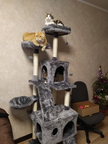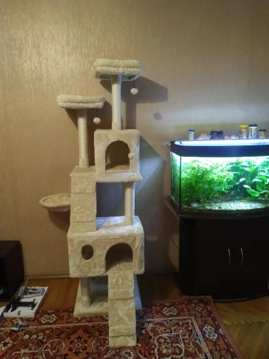 Доставили заказ в г.Казань за 5 дней,раньше предполагаемого срока.Упаковано в 1 большую тяжелую коробку. Кошачий комплекс понравился:легкий в сборке - собрала сама за 2,5 часа.Крепеж и ключ входят в набор. В коробку вложили 2 инструкции и запасной помпончик :) Отсканировала qr-код на ней и получила очень доходчивую видео-инструкцию.Искусственный мех не особо рыхлый,изнанка материала понравилась.Гнездо позже переставила на другой уровень,чем он предполагается по инструкции.А именно на уровень второго домика.Нижнюю лесенку предполагаю убрать совсем,чтоб мы не спотыкаться об нее на проходе.Так что,ребята,можно немного модифицировать конструкцию под свои нужды.Котиков у меня двое:один молодой сразу начал изучать новые владения и примеривать свою тушку в разных местах,а вот кошка-старушка и высоты боится и вообще не очень уютно себя чувствует внутри. Пока не впихнешь в домик, сама не заходит. Пока ищем варианты как ей помочь с адаптацией с помощью любимого пледа, кошачьей мяты и проч.