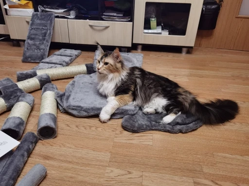 Отправляли долго, пришло быстро, как раз на день рождения кошечки, комплекс классный,мягкий, единственное верёвка не особо хорошая, но это поправимо, старый домик пока роднее, собрали быстро, продавцу спасибо
