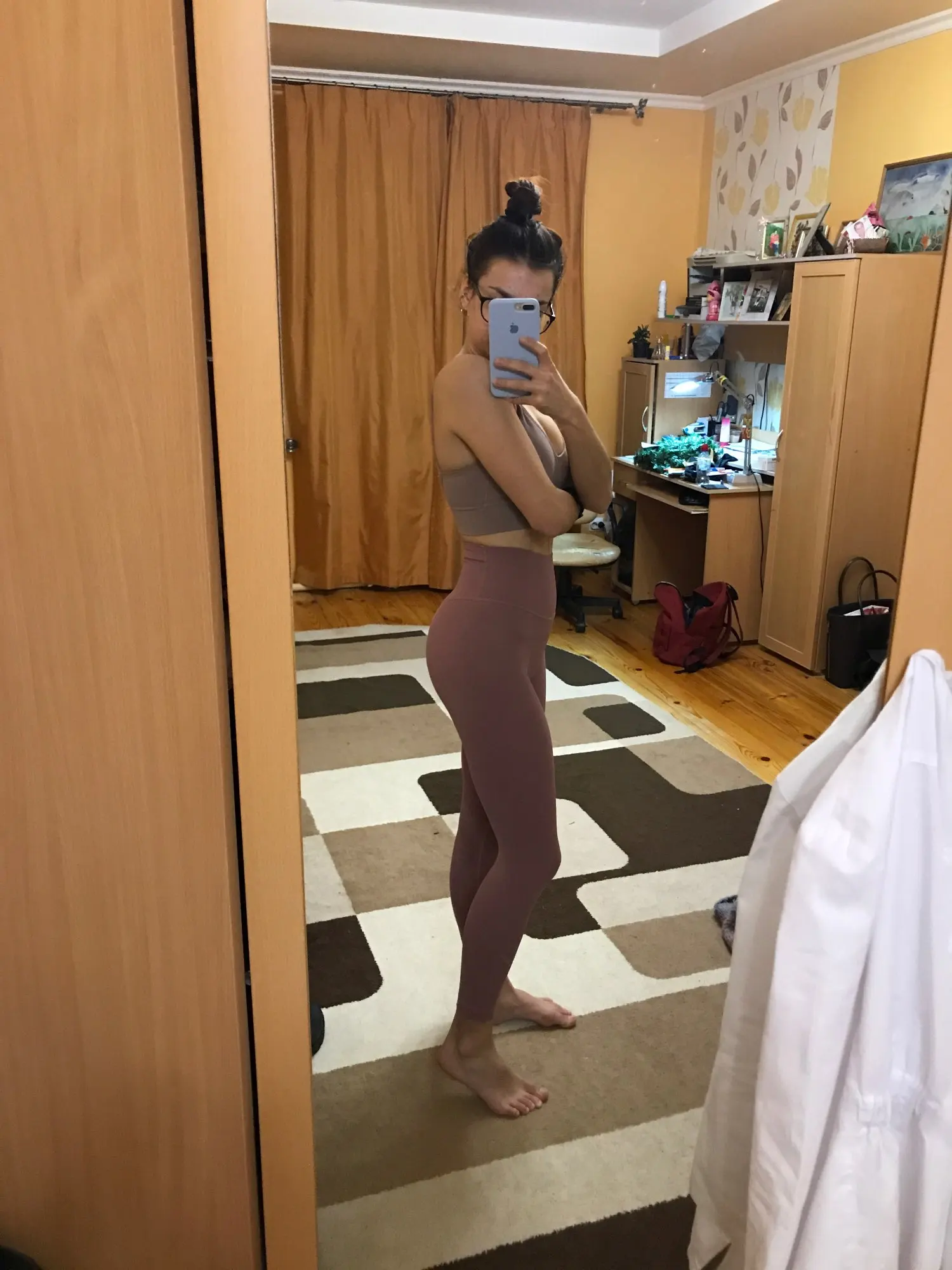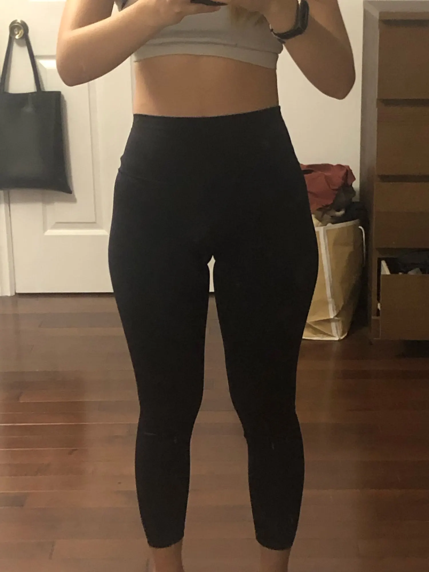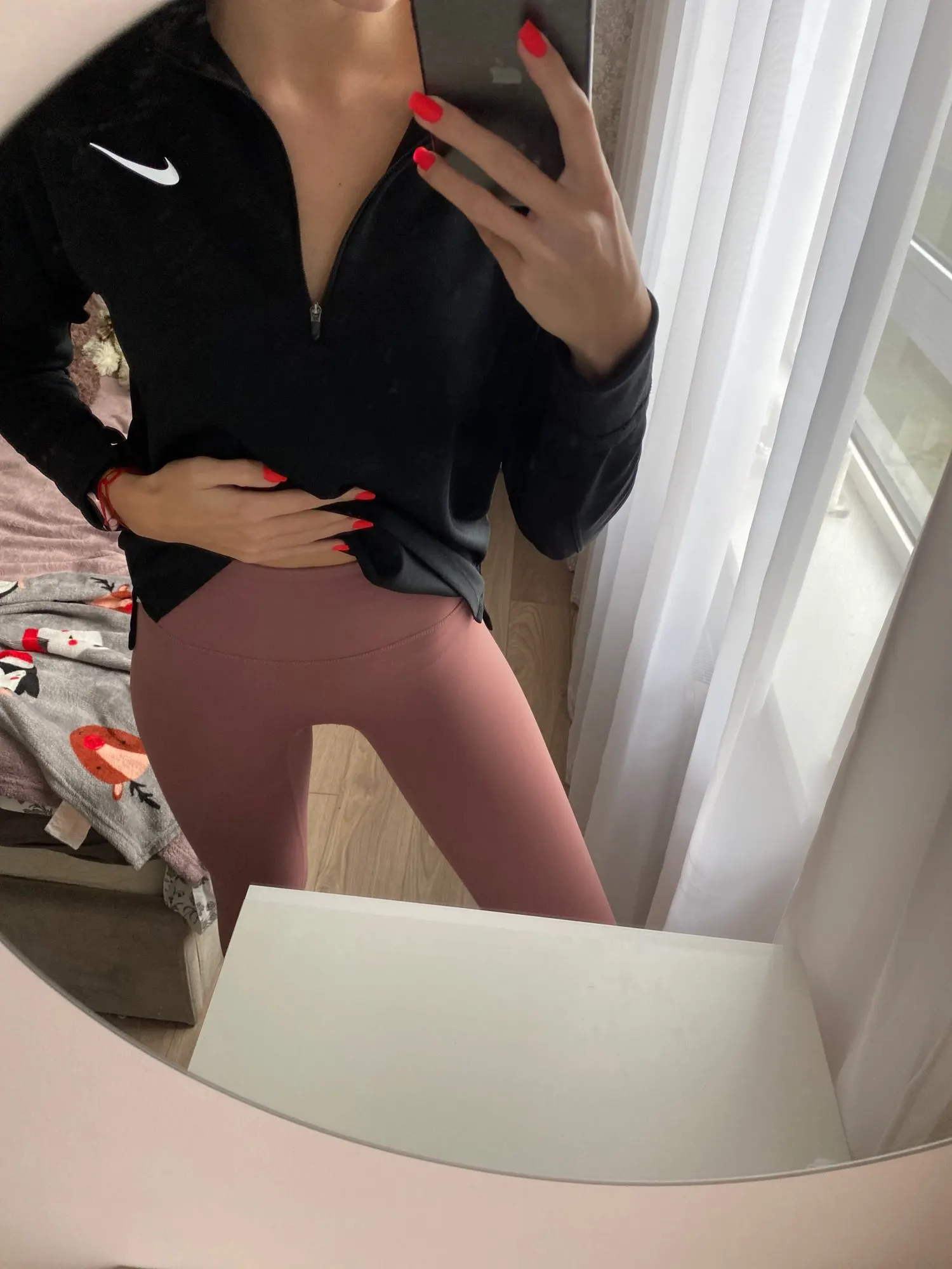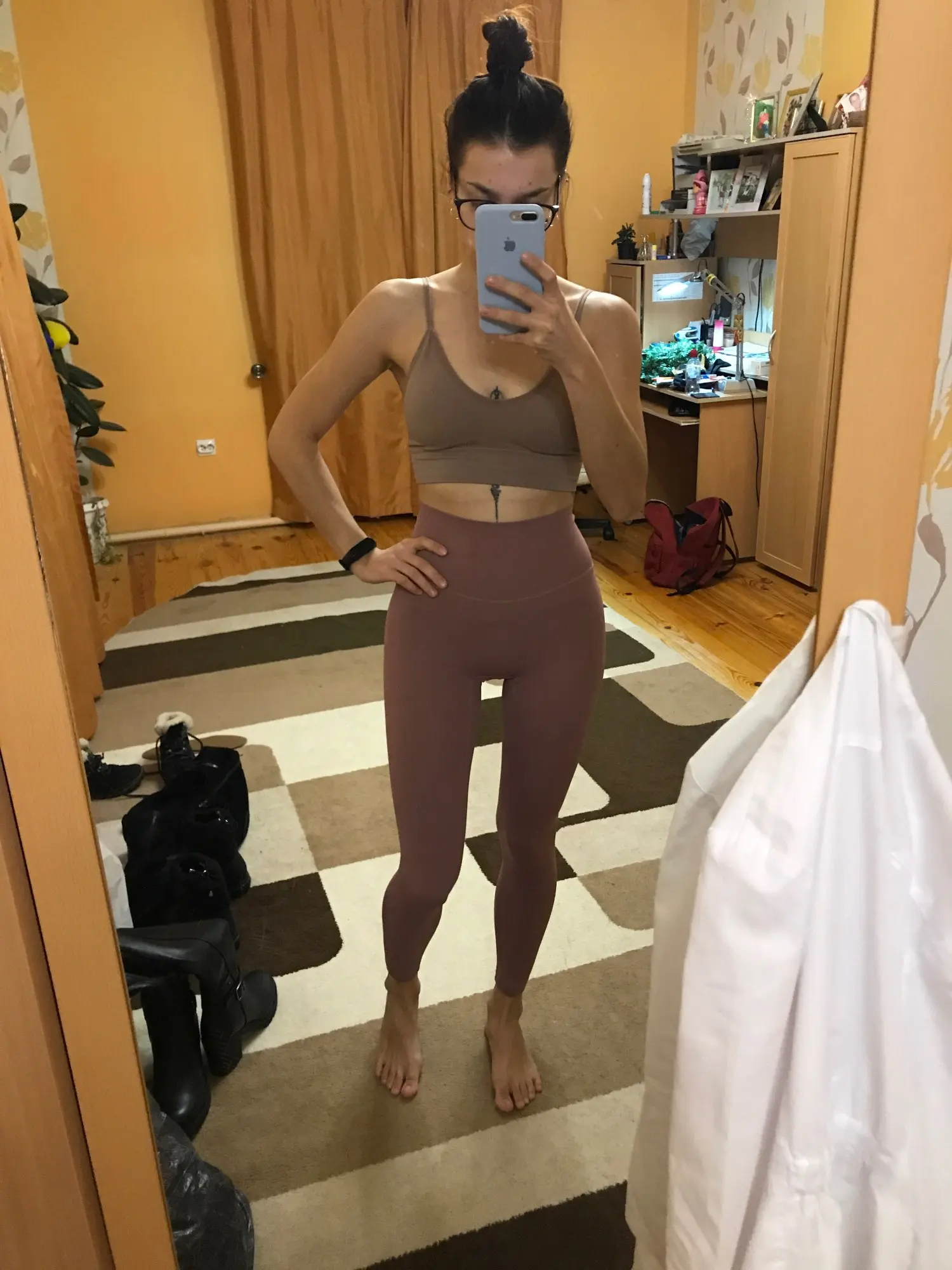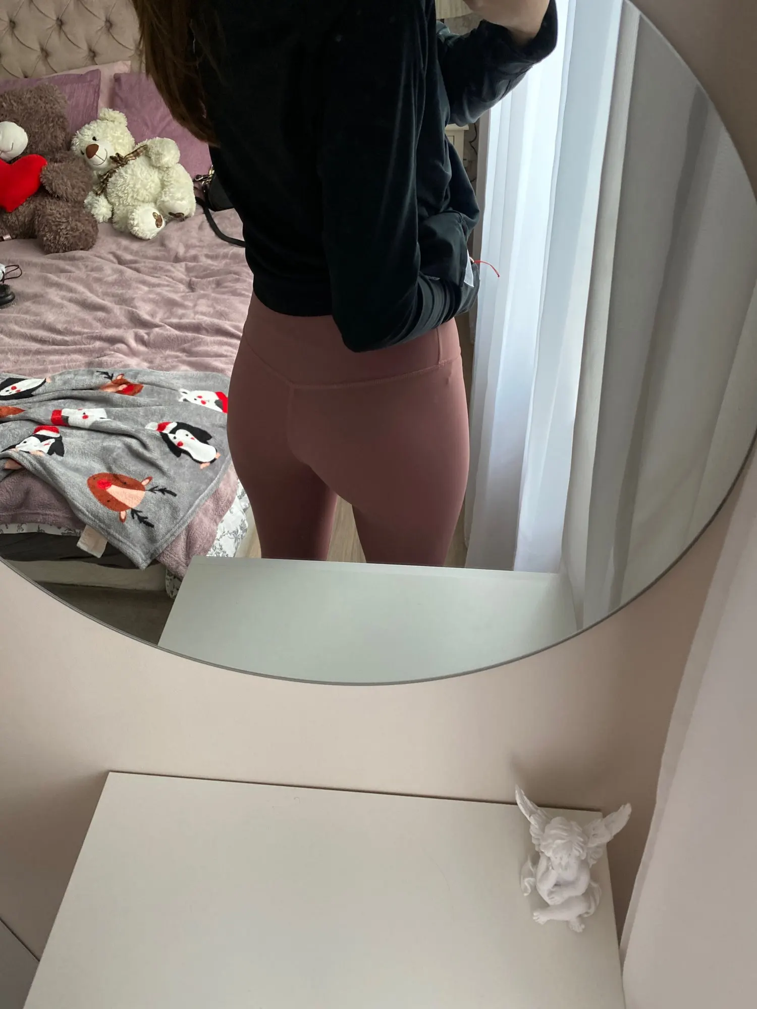 Невероятные леггинсы, точно такие же, как и у lululemon! Длина по щиколотку, 158 см (самый маленький размер), хорошее сжатие вокруг живота.