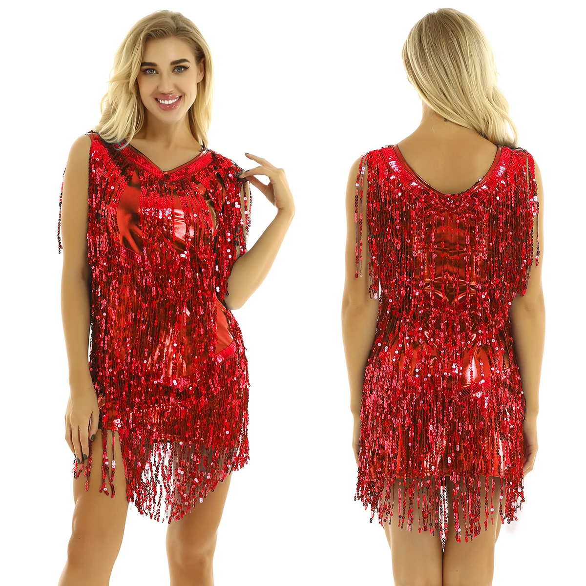 Женский костюм для латиноамериканских танцев, без рукавов, с блестками и бахромой, с V-образным вырезом
