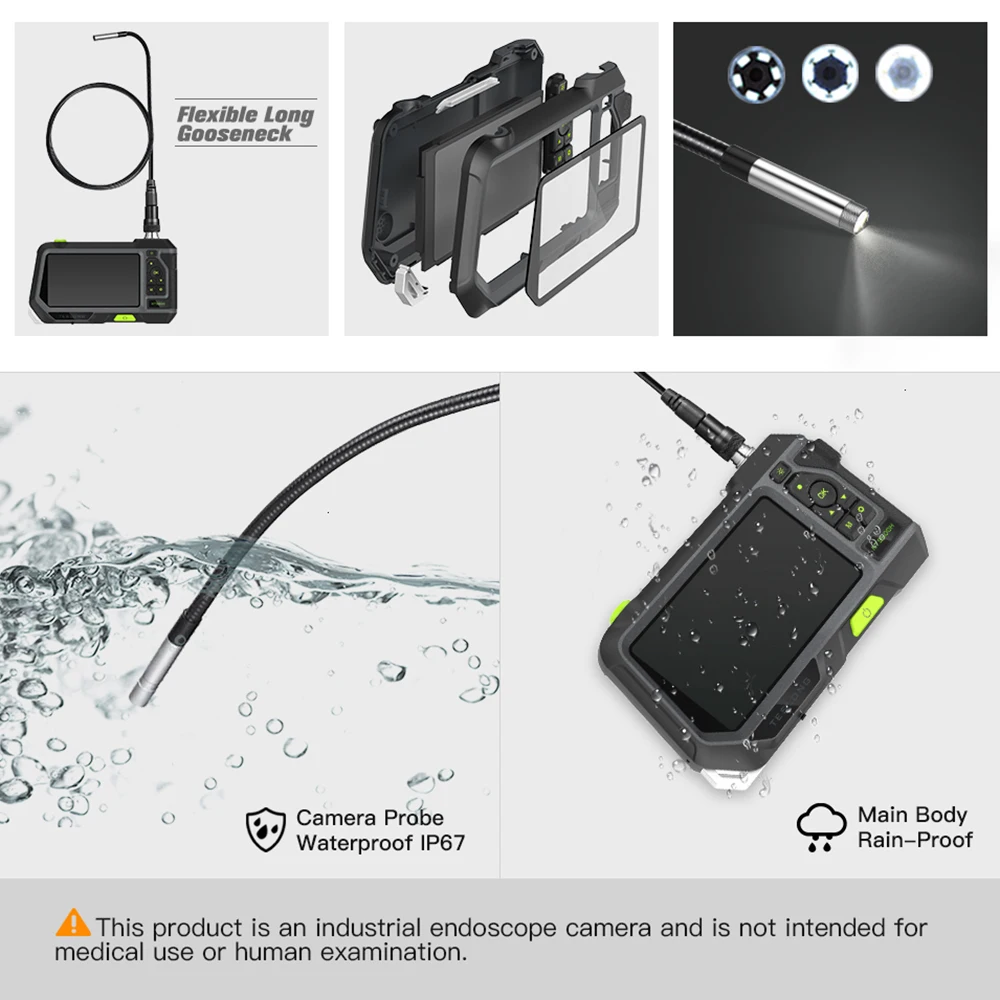 Монитор: Тип экрана: 5 дюймов Цвет ЖК-дисплей Разрешение: 1920*1080 пикселей (QVGA) Вращение: 360 ° Разрешение камеры: 1920*1080 Разрешение фото: 1920*1080 Разрешение записи: 1280*720 1920*1080 Язык: английский, китайский, немецкий, французский, испанский, итальянский, русский, японский Порт: Порт удаленного подключения, USB, слот для tf-карты 32G TF SD карта Камера: Диаметр: 7,6 мм/5,5 мм/3,9 мм/12,5 мм опционально Диаметр вала: 7 мм/5 мм Длина вала: 100 см/300 см/500 см (полу-жесткий кабель) Разрешение: 2,0 мегапикселей Угол обзора: 70 ° Глубина поля: 30 мм-60 мм Светильник источник света: 6 Регулируемых светодиодов высокой интенсивности Прочее: Светодиодный светильник вспышки: 1 Вт CREE светодиодный Рабочая температура: от 32 до 113 °F (от 0 до 45 °C) Мощность: 3500 мАч литиевая батарея (в комплекте) Срок службы батареи: 4-5 часов Сертификат: CE FCC RoHS