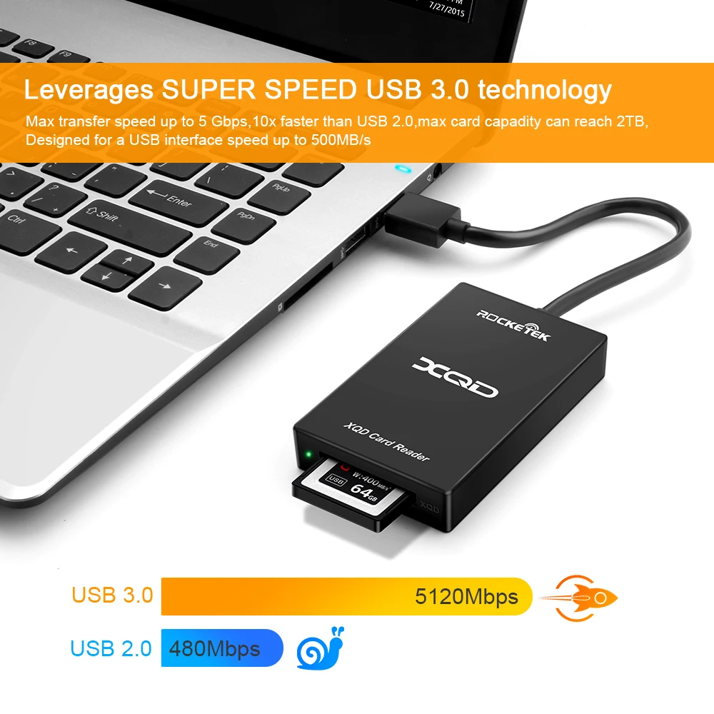 【Обновленная версия 】 читатель rocketek XQD. Кардридер XQD совместим с XQD G-Series и XQD M-Series для Windows/Mac OS. Считыватель карт памяти USB 3,0 XQD【XQD Card Only】 это Rocketek новая улучшенная версия XQD reader, мы устраняем другие функции и только для XQD G-series и M-series card. Интерфейс изготовлен из высококачественного материала, который был усовершенствован, чтобы сделать передачу данных быстрее. Примечание: Убедитесь, что ваша карта имеет отметку G или M, в противном случае она не будет поддерживаться этим читателем.