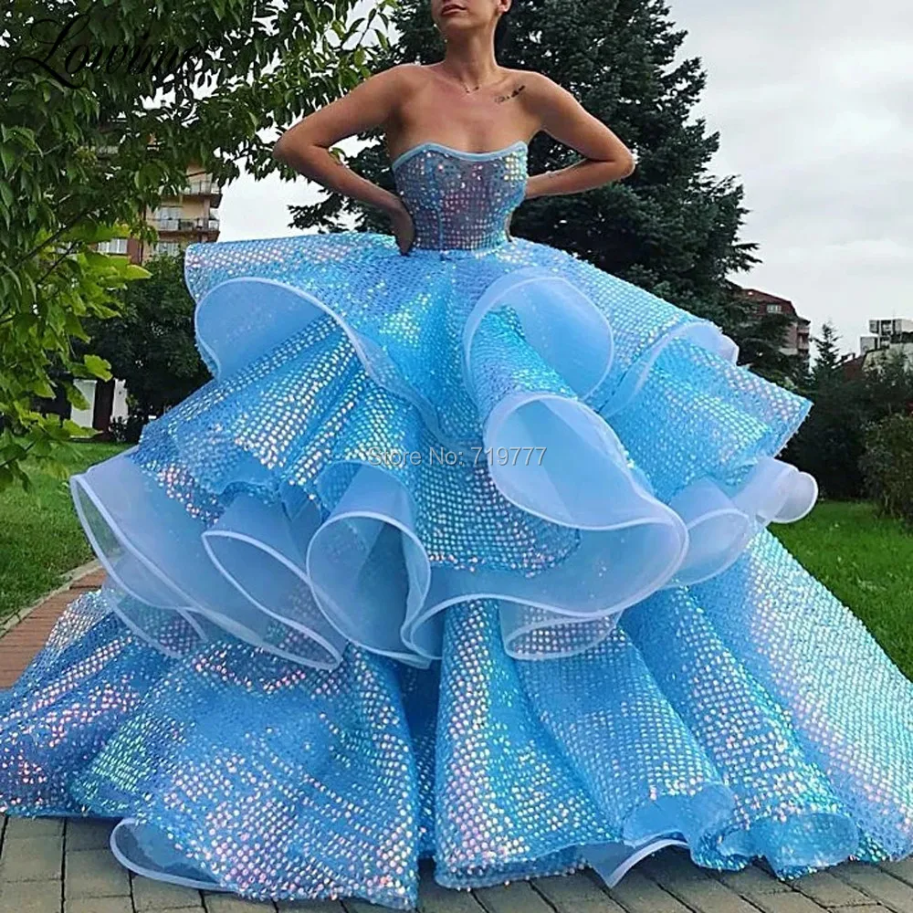 Блестящие синие Выпускные платья бальное платье Многоярусное вечернее платье без бретелек органза Саудовская Аравия женские вечерние платья 2020 Новое поступление платье