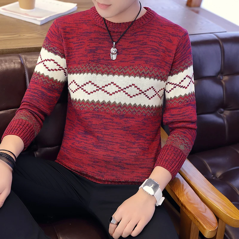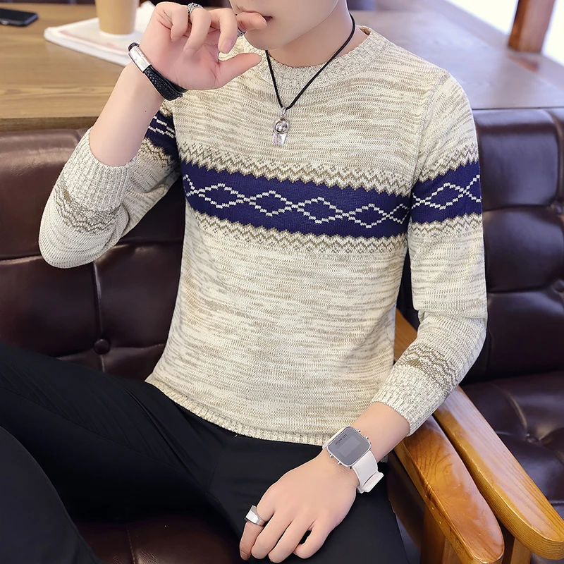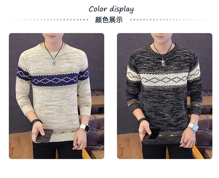 Свитер мужской вязаный, с круглым вырезом и длинным рукавом, в полоску