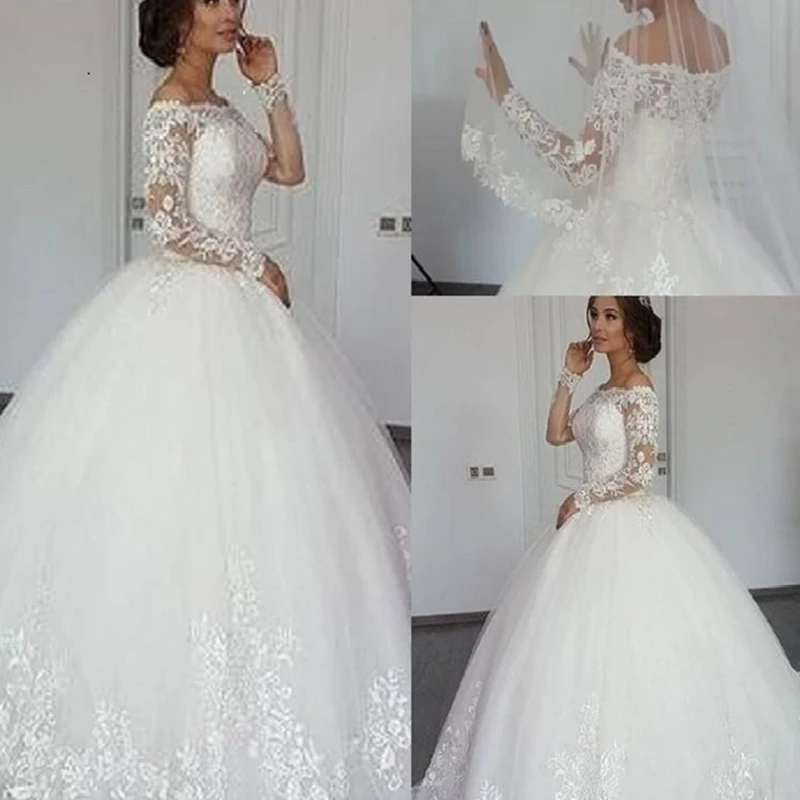Кружевное свадебное платье, платье принцессы, платье невесты до пола с аппликацией и длинным рукавом, бальное платье с вышивкой, красивые свадебные платья