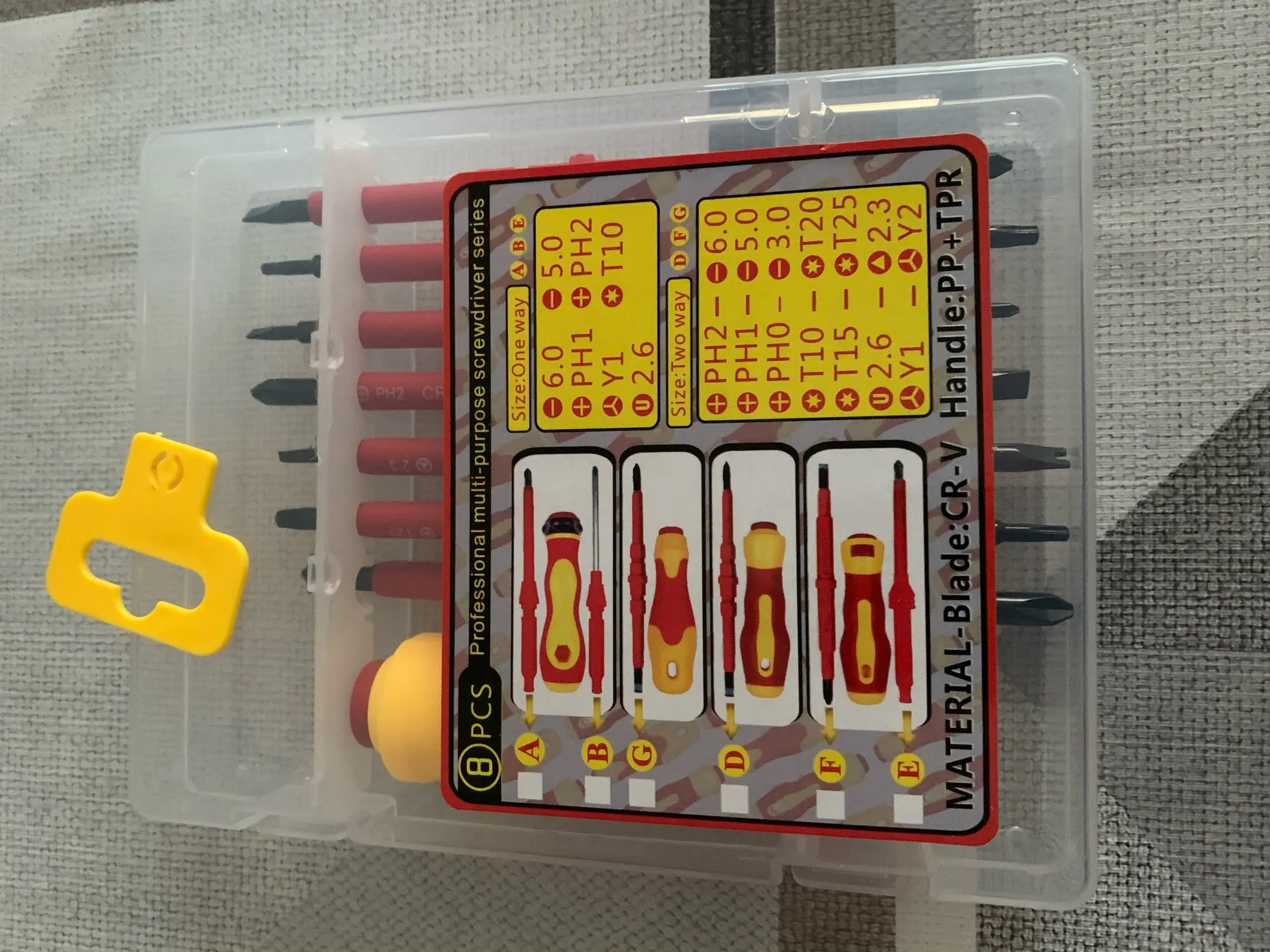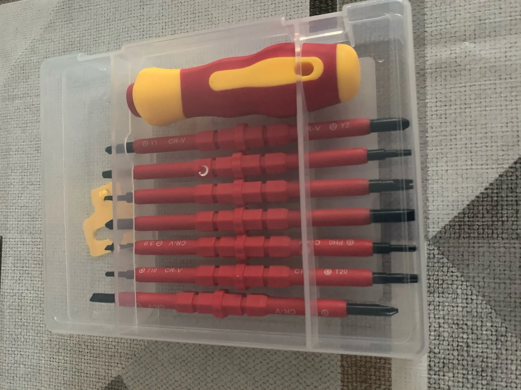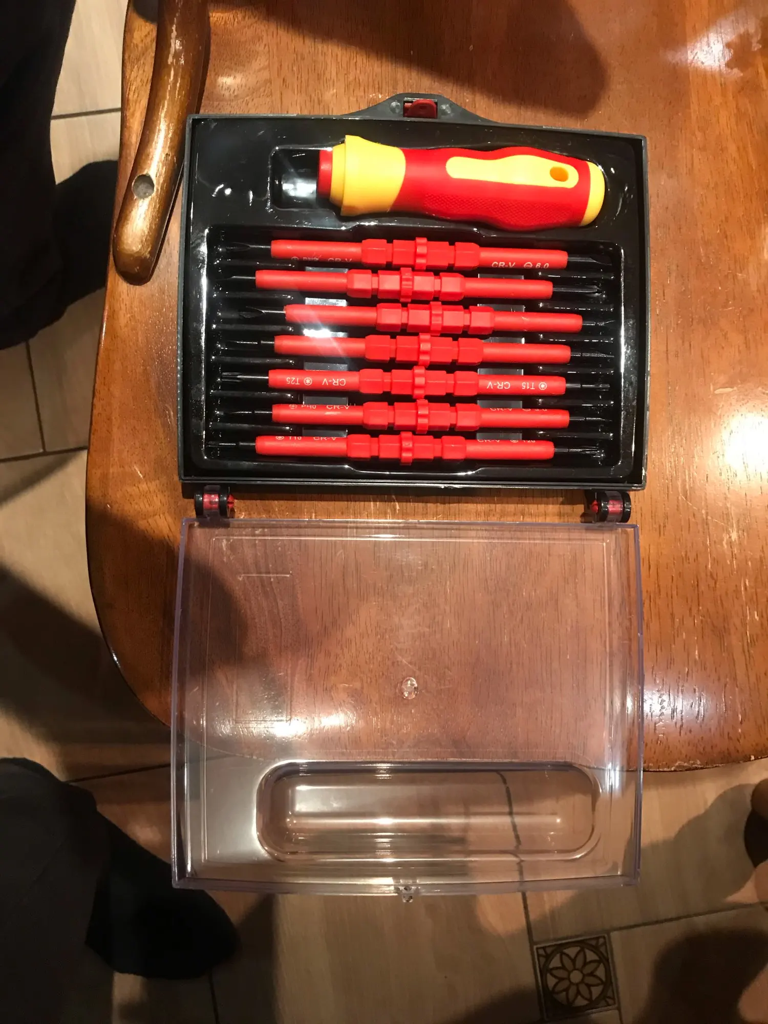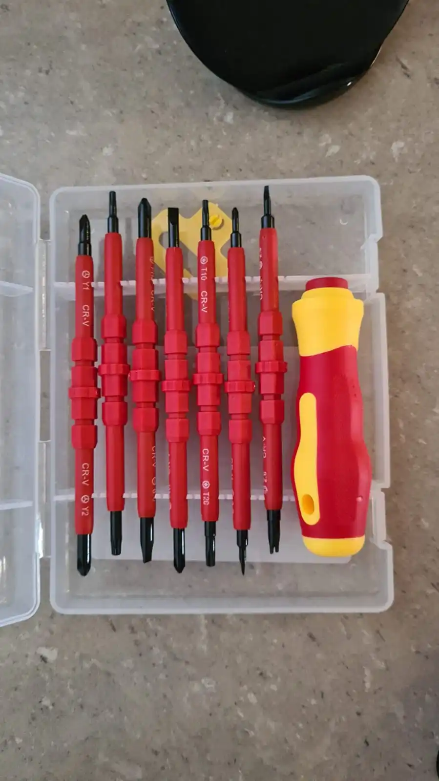 Достаточно приличные отвёртки на первый взгляд, всё аккуратно, не пахнет, на вид надёжно. По фото прозрачный кейс компактнее и оказывается есть ещё вертикальный набор думаю лучше брать его, что бы меньше места занимал.