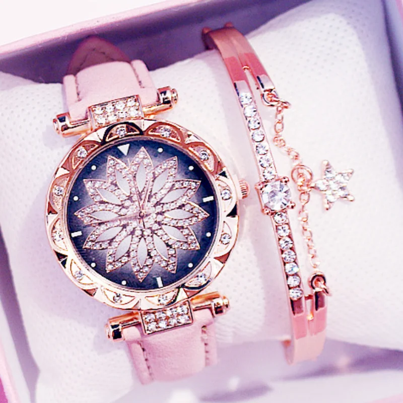 Женские часы-браслет комплект со звездным небом с украшением в виде цветков часы со стразами; Повседневные кожаные кварцевые наручные часы Relogio Feminino