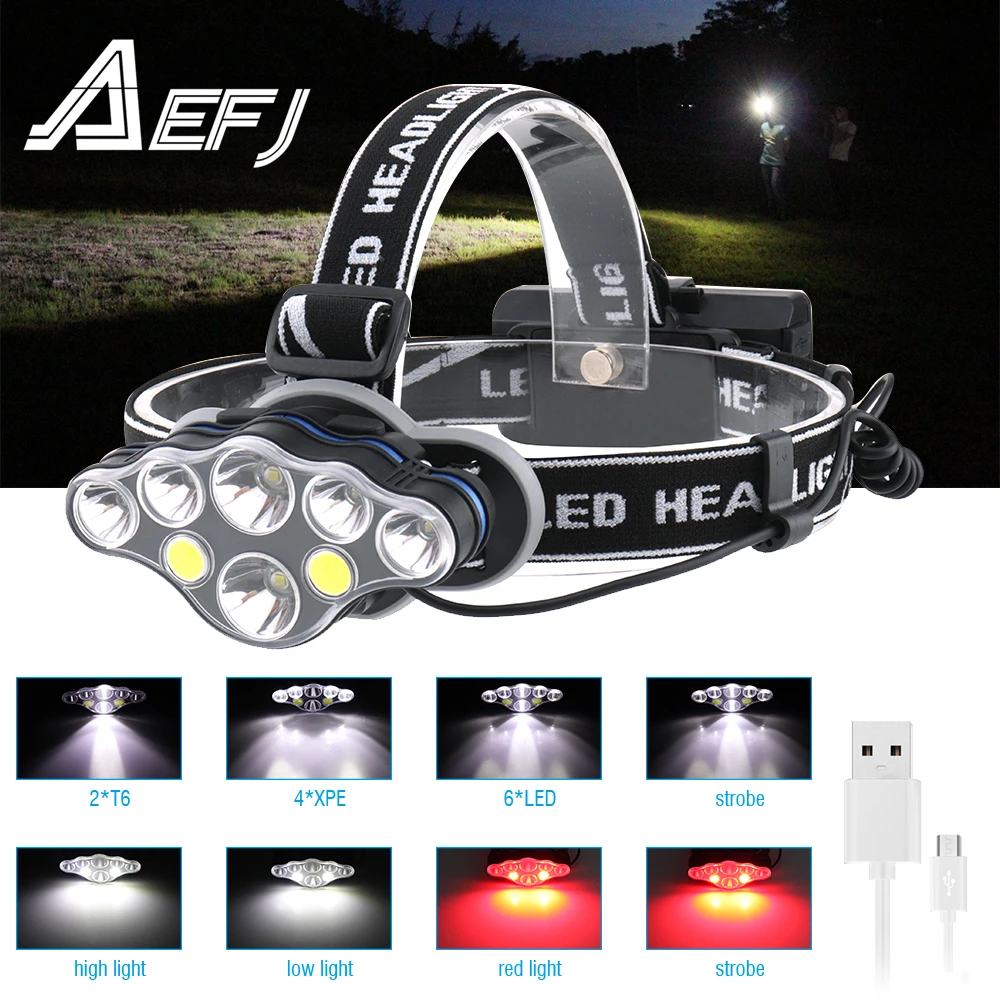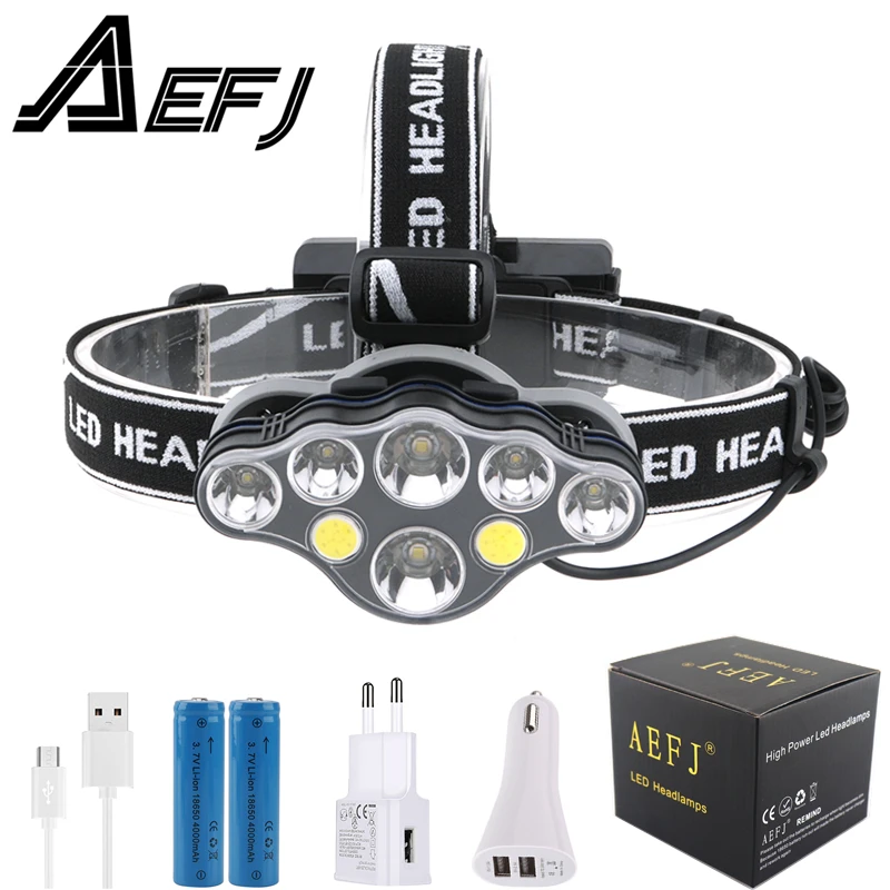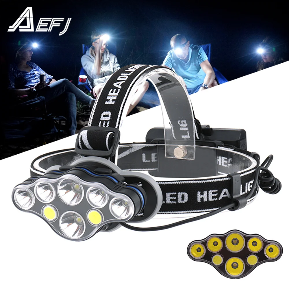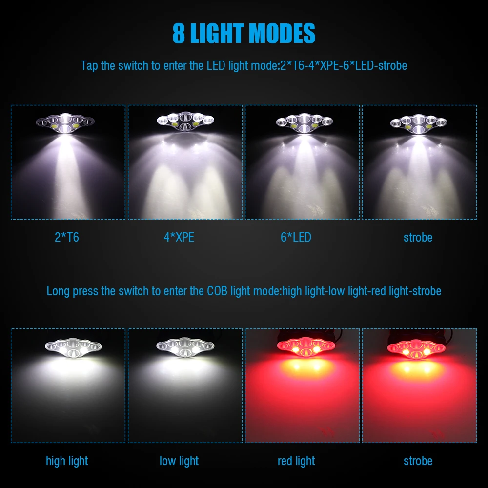 Супер яркий, легкий T6 + COB 8 * светодиодный налобный фонарь с аккумулятором 18650, водонепроницаемый охотничий фонарь