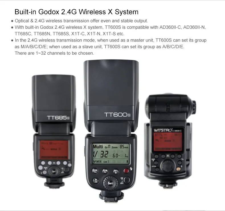 Со встроенной беспроводной системой Godox 2,4G X, TT600S совместим с AD360II-C/AD360II-N/TT685C/TT685N/X1T-C/X1T-N и т. д.