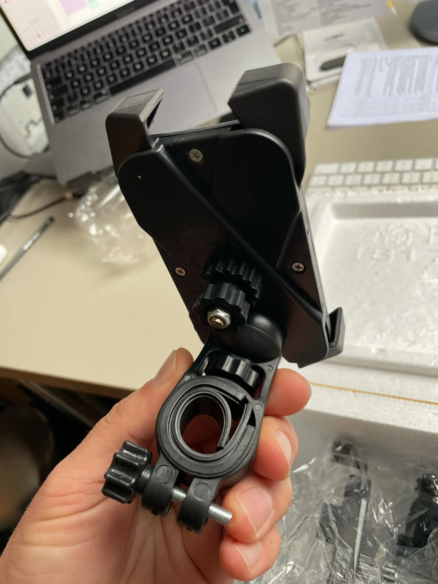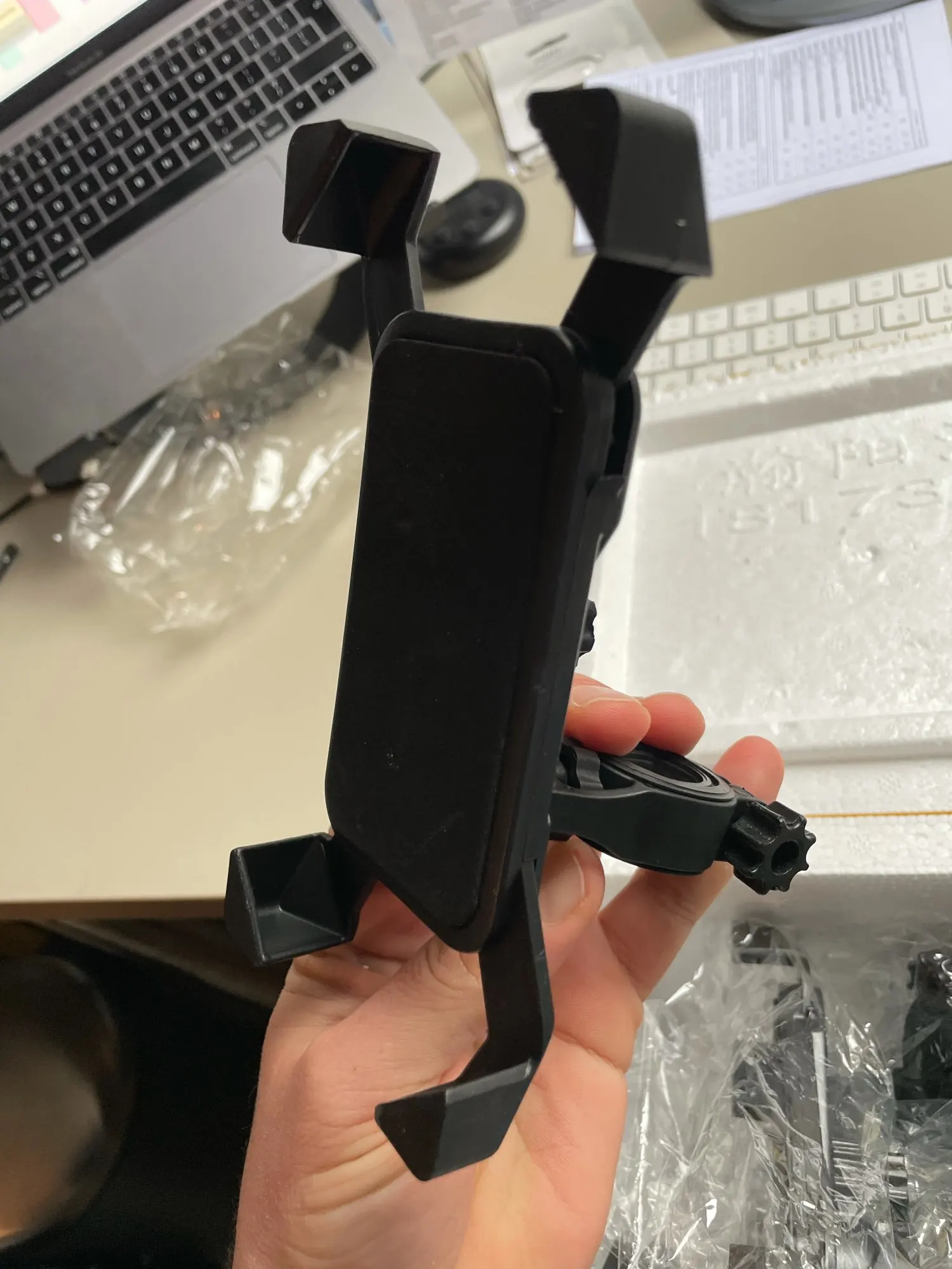 Держатель окупала для мотоцикла, ещё не пробовала, не сезон. Потом отпишусь дополнительно. Но выглядит немного хлипким, есть сомнения, что не выпадет телефон на скорости или неровностях на дороге.