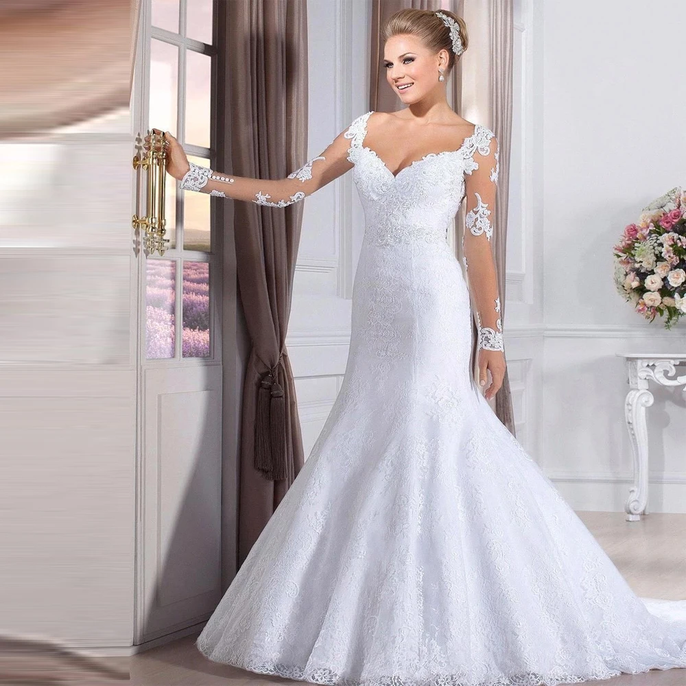 Кружевное облегающее свадебное платье с длинным рукавом и аппликацией милой русалки Свадебные платья с естественной талией Индивидуальный Пошив