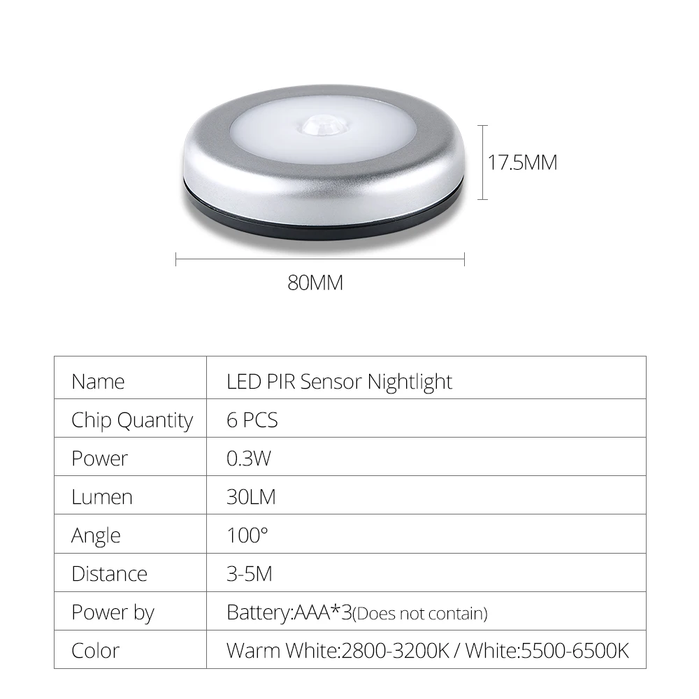 Особенности:Светодиодный светильник с PIR датчиком, функция только в темной среде автоматически запускается, когда окружающая среда является ярким автоматическим сном.Автоматическое распознавание: светильник загорится, когда вы получите его в пределах 3 метров, и он погаснет через 20 секунд после того, как вы пройдете за пределы его чувствительного диапазона.Простая установка: встроенный магнитный утюг внутри, который может адсорбировать его на железной поверхности, такой как холодильник, В то же время 3m двойной клейкой стороной предоставляется для приклеивания к поверхности неметаллических мест.Высокая яркость, 6 светодиодов обеспечивают достаточный светильник в этой области, и это энергосбережение.Питание от аккумулятора: питание от 3 батарей AAA(Не входит в комплект).Идеально подходит для коридоров, мастерских, подвалов, крытых гаражей, лестниц, дверных проемов, шкафов и других темных мест в вашем доме.Примечание: Этот светильник для обнаружения движения не является водонепроницаемым.Спецификация:Тип: Ночной светильник с активированным движениемМатериал: АБС-пластик + магнитное железоЦвет изделия: белый/теплый белыйКоличество СВЕТОДИОДНЫЙ: 6 шт.Угол датчика: 100 градусовСветильник с задержкой: прибл. 30sСветильник Цвет: теплый белый (2800K-3200K); Белый (5500-6500K)Режим: выкл/вкл (без кнопки переключения)Батарея: 3 * AAA батареи(Не входит в комплект)Посылка:1 * Светодиодная лампа