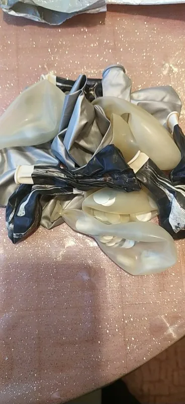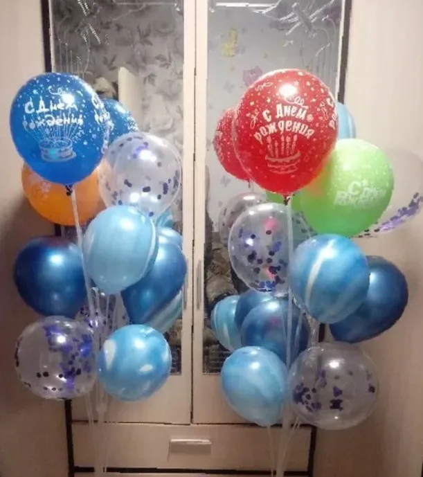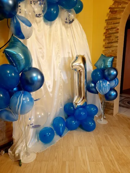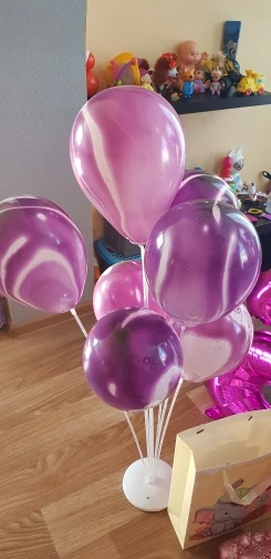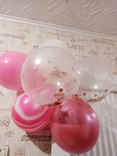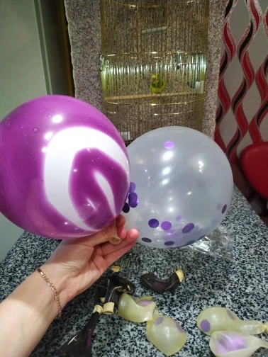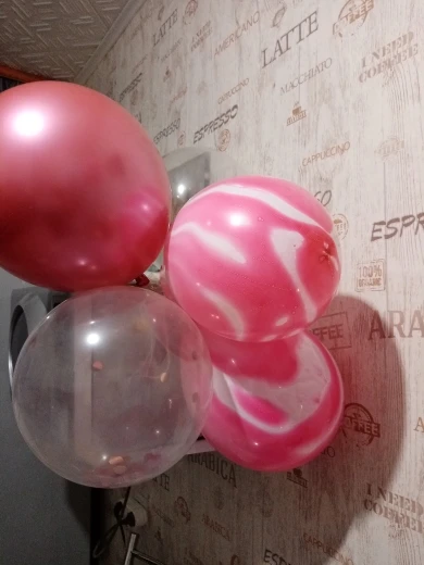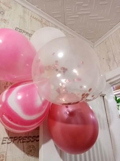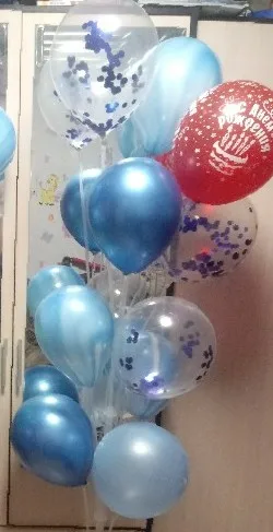 Заказывала цветные- полосатые и прозрачные с золотыми конфетти. Цветные шарики маловаты однако, см 20 больше страшно надувать, лопаются, хотя качество неплохое. Понравились прозрачные с конфетти, вот они большие, эластичные, но конфетти крупноватые и плохо держатся на стенках, хоть и терла о шерсть, чтоб хоть сейчас счёт электризации держались)) На фото шарам 3 недели уже. Подставку заказывала отдельно на Али.