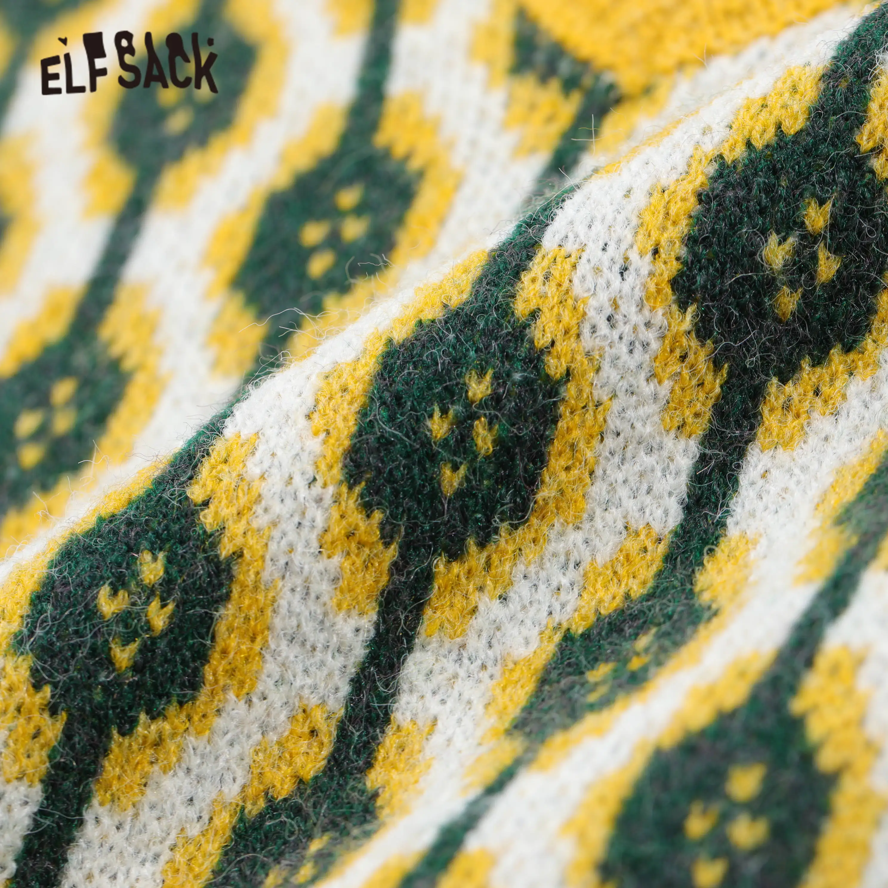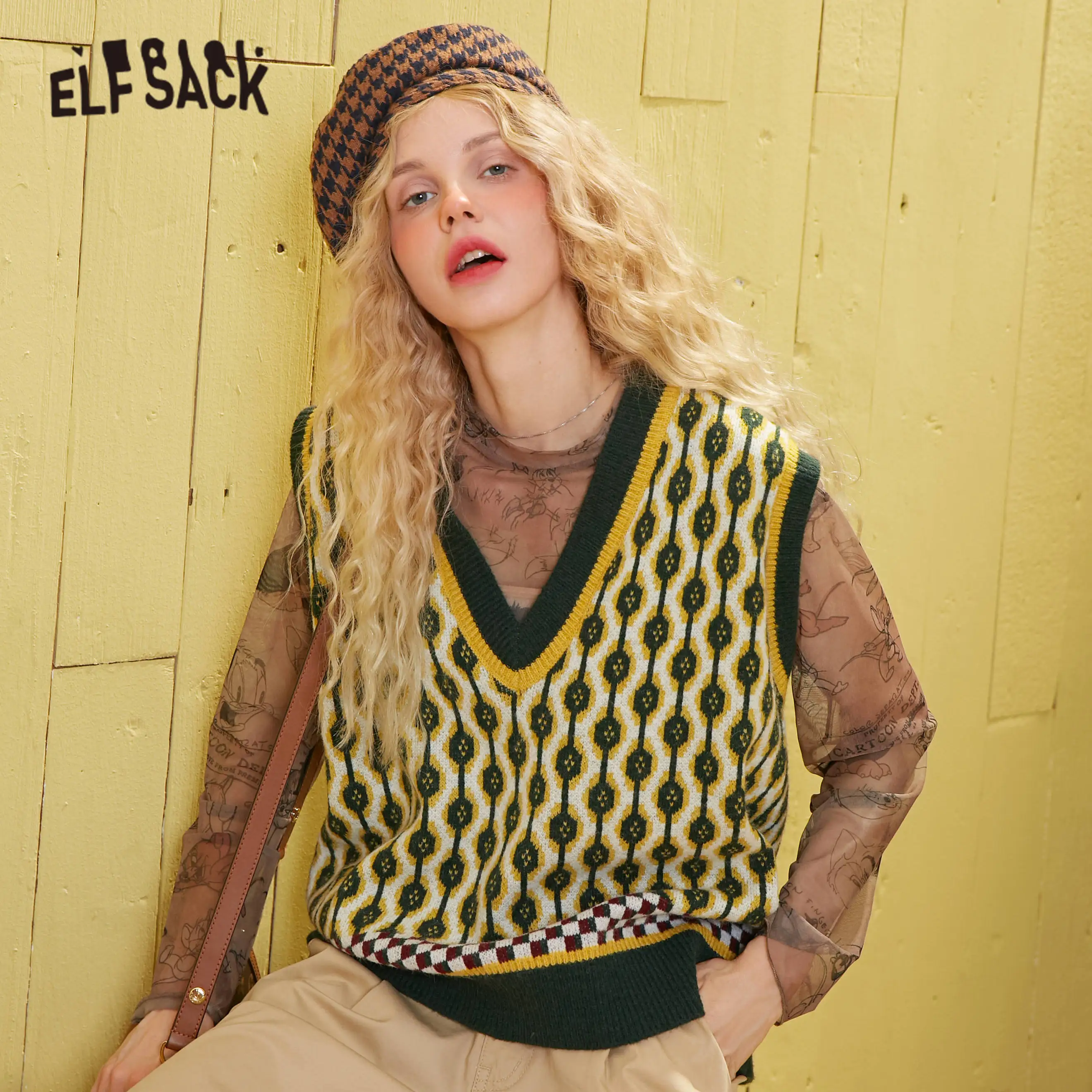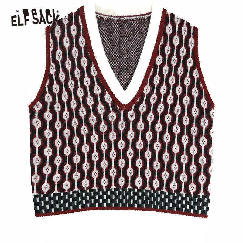 Женский Жаккардовый трикотажный пуловер ELFSACK, зеленый Повседневный свитер-жилет бордового цвета с v-образным вырезом, без рукавов, весна 2020