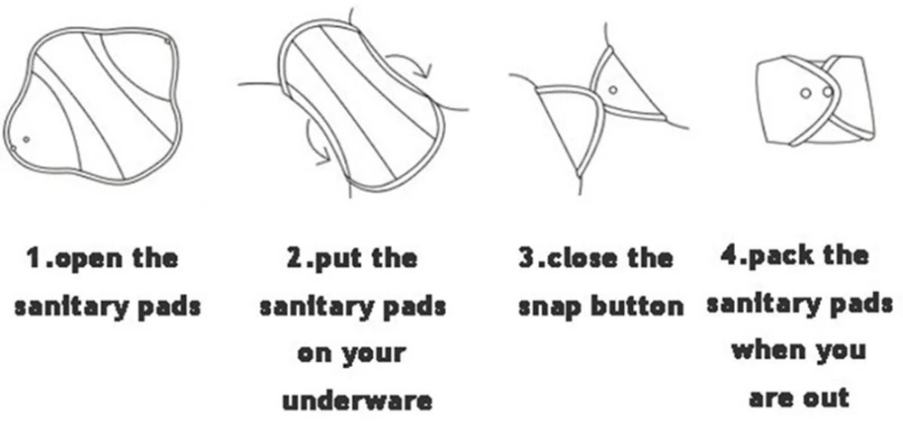 Перед первым использованием Вымойте тканевые подкладки. Защелкивающиеся подушечки вокруг нижнего белья. Меняйте подушечку каждые 2-6 часов или по мере необходимости. Когда вы находитесь вдали от дома, поместите использованные прокладки в мини-сумку, пока не вернетесь домой. Затем мойте согласно инструкциям по уходу. Избегайте стирки прокладок в общественных местах. Прокладки предназначены только для личного пользования и не должны использоваться совместно с другими.