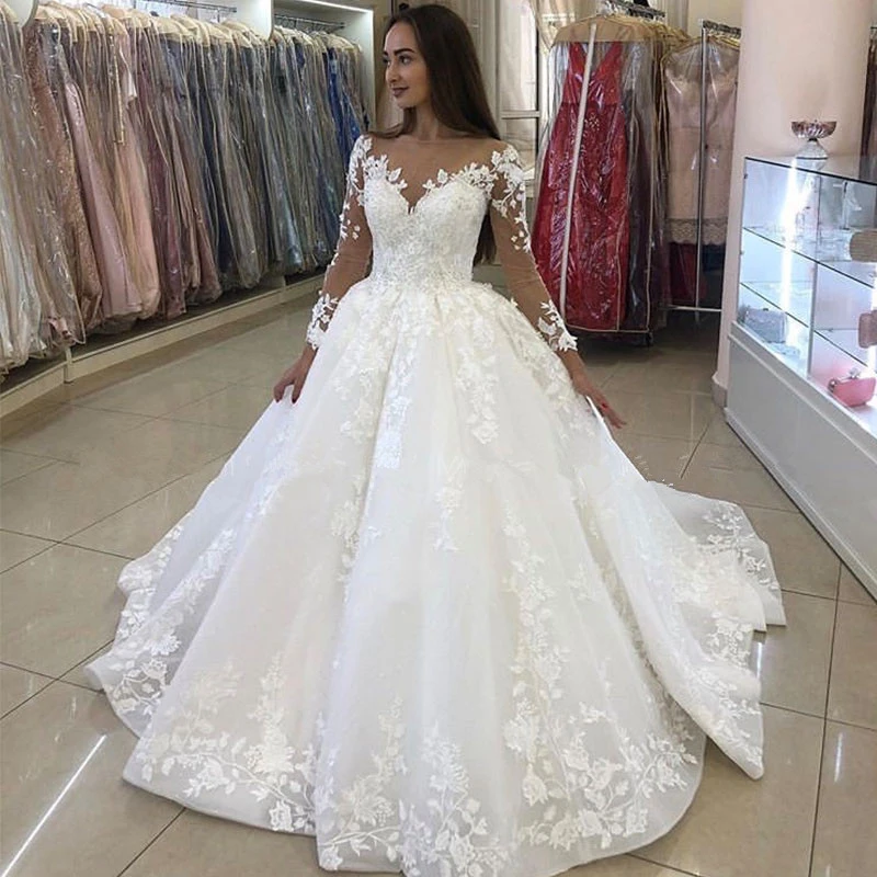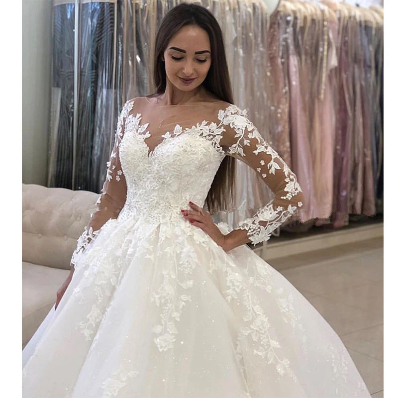 Кружевное бальное платье принцессы с длинными рукавами и аппликацией