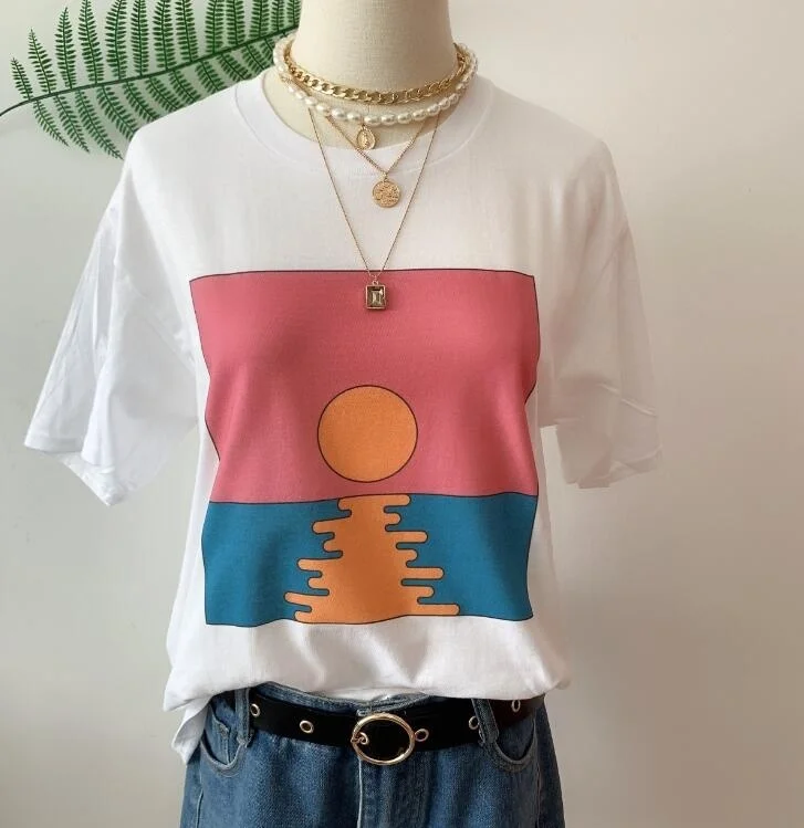 Sunfiz HJN мечта утра женщин восход солнца над планкой Женский Ретро стиль эстетическое искусство футболка Симпатичные летние топы