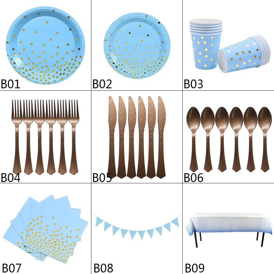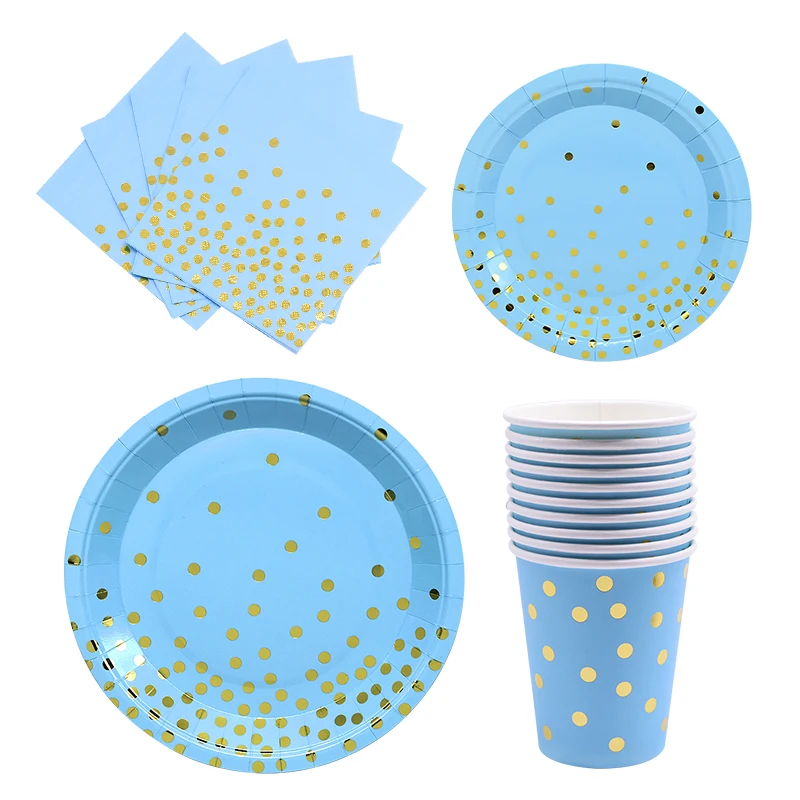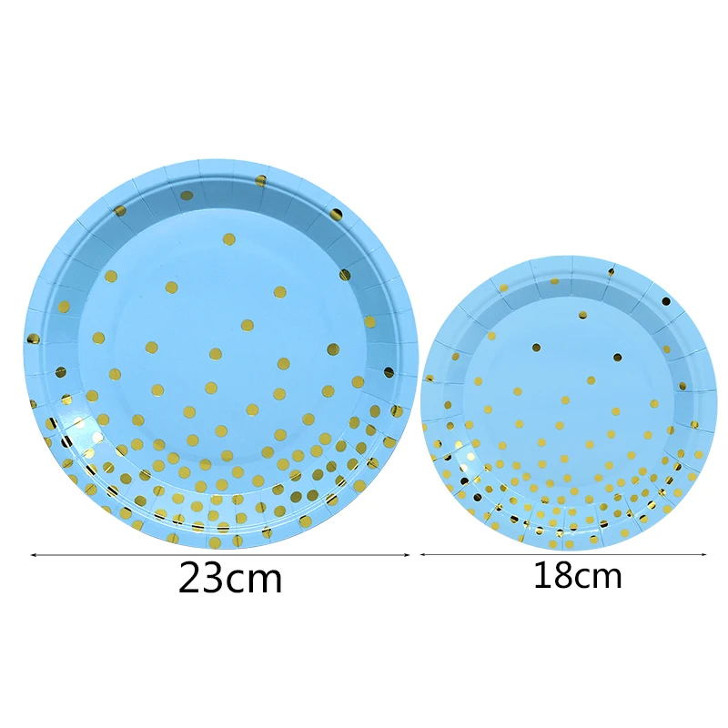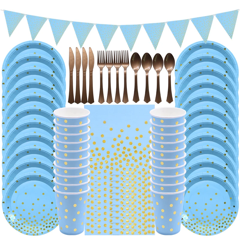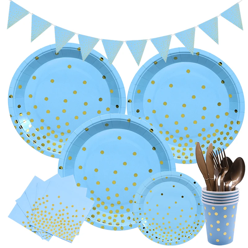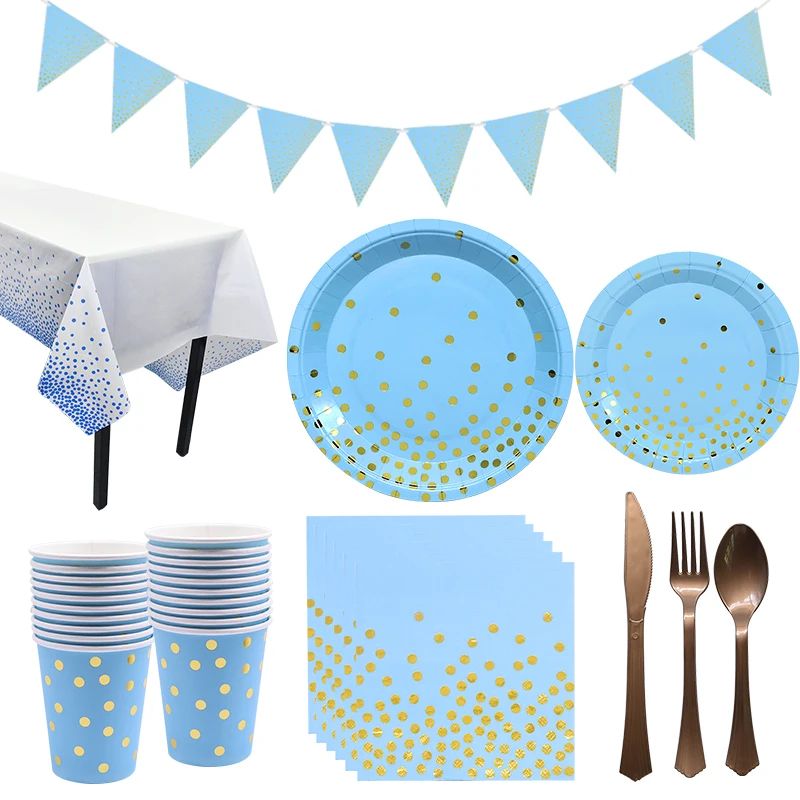 Набор одноразовой посуды в голубой горошек, соломинки, треугольный баннер, товары для детского дня рождения