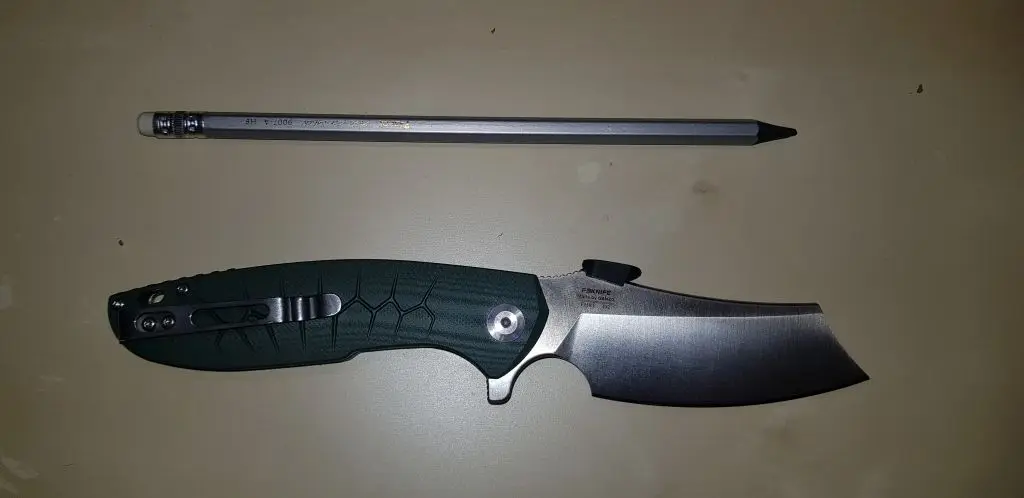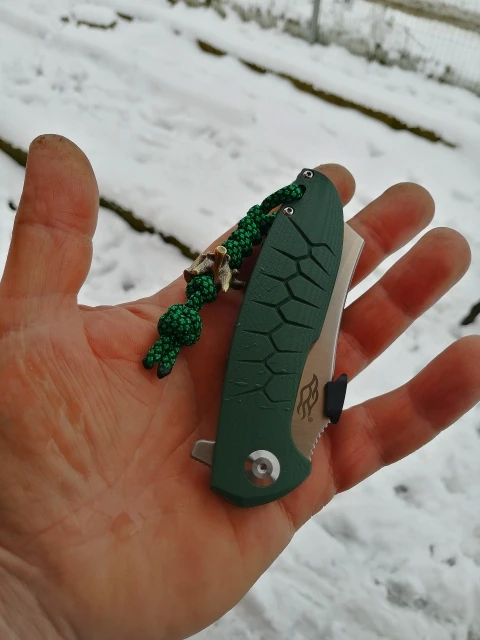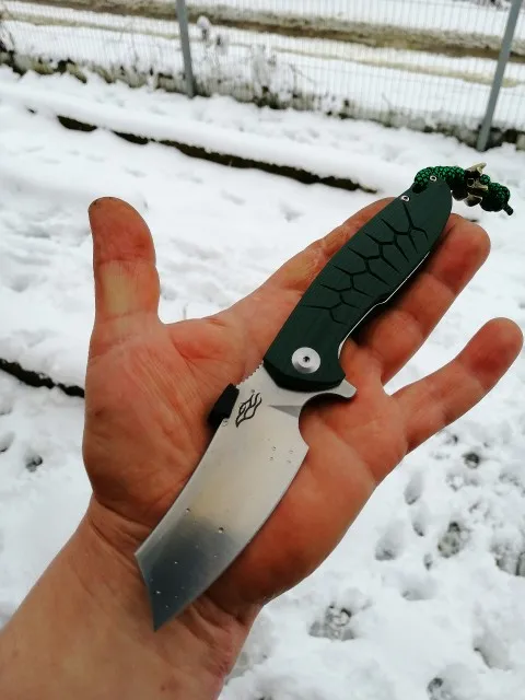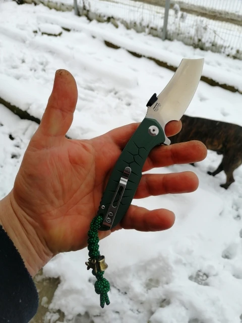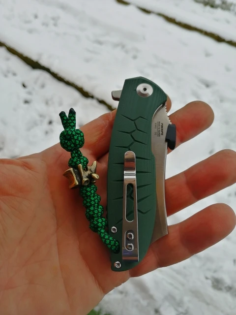 Отличная тяпочка!! Качество, Механика и обработка материалов на высоте! Работает мягко, закрывается под своим весом. Рекомендую! Даставка почти 2 мес. СДЕКом курьер домой привёз. Удобный чойл для деликатных работ, обух скруглён, глубокая клипса, хорошо в руке лежит. Не большой, 85мм клин, 75мм РК, но вполне хватает. Три способа открытия - плавник, таблетка и она же вейв. Таблетку можно снять, но будет вырез на клине. На мой взгляд она даже подчёркивает необычность данного ножа, но хотелось бы в цвет рукояти, тогда вообще огонь! Попробую сделать сам как нибудь. В общем ножеманы не пожалеют! Про сталь позже скажу, да и вообще как он в поюзе. Из коробки как бритва, посмотрим сколько держать будет. Дополню обязательно!