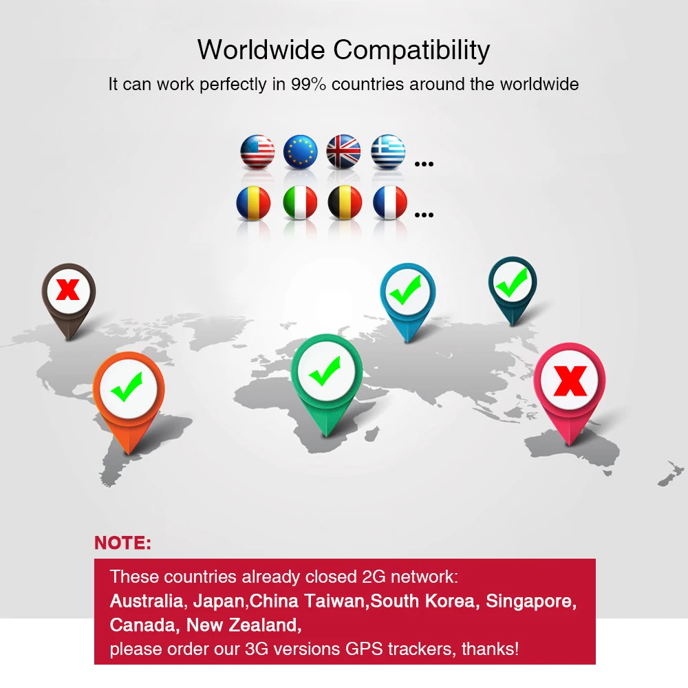 Этот GPS трекер TKSTAR TK905-это 2G GSM GPS трекер. Он работает на основе существующей сети 2G GSM/GPRS и gps-спутников. Если ваша страна закрыла сеть 2G, вы можете выбрать другой продукт 3G!