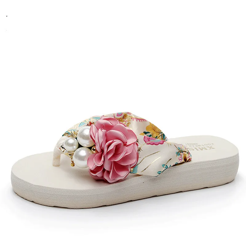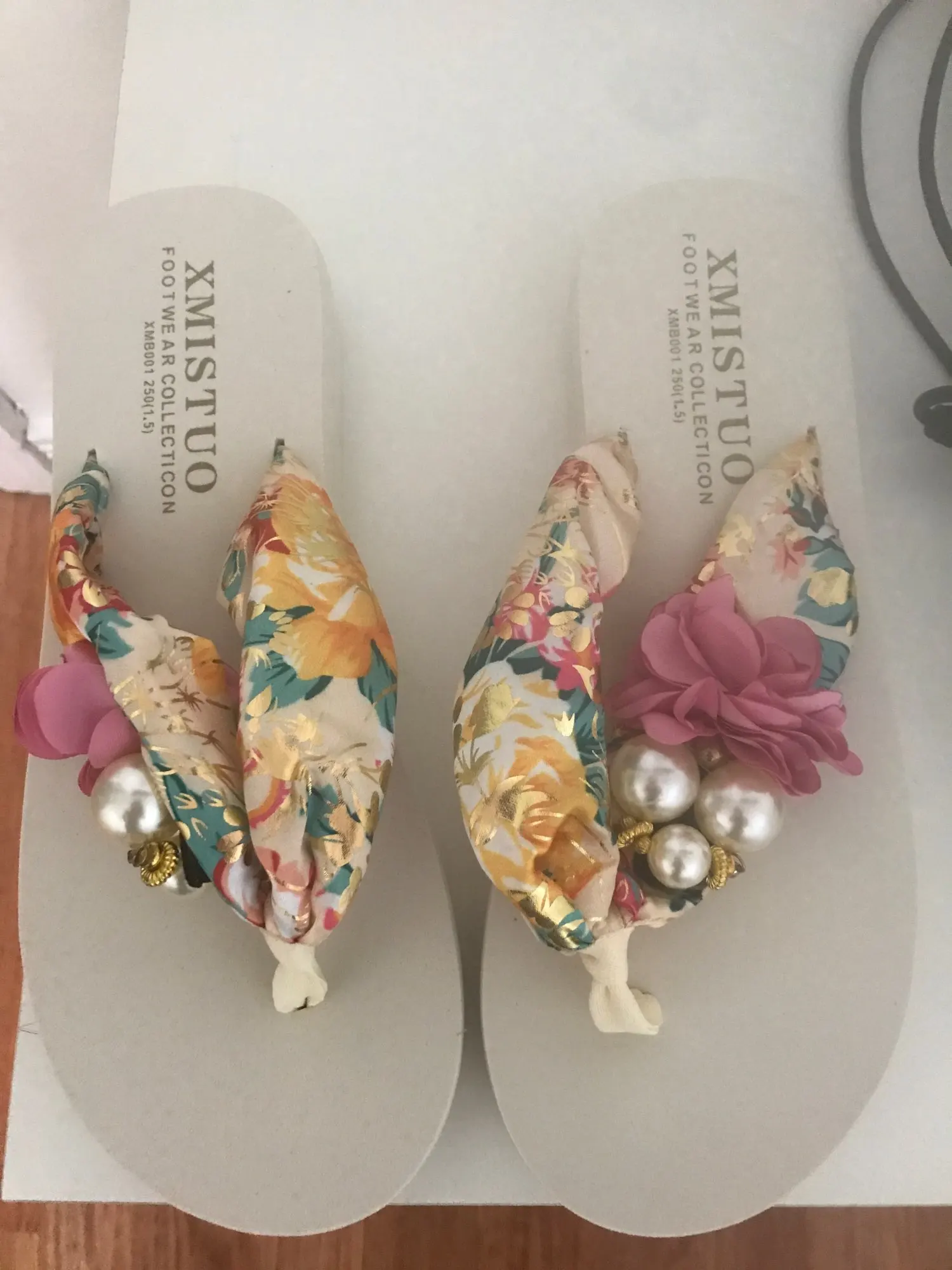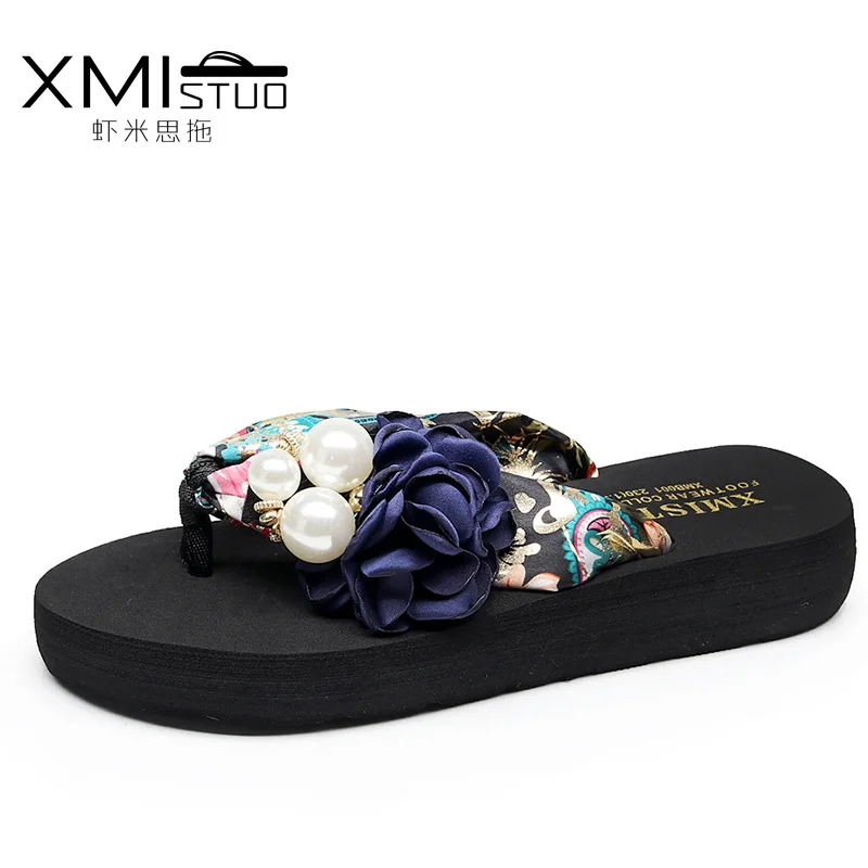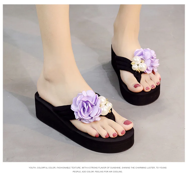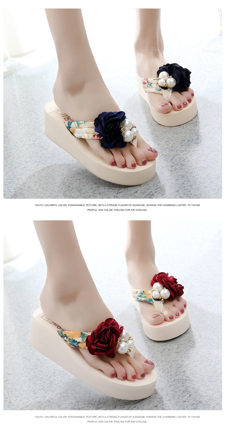 Женские пляжные шлепанцы на высоком каблуке 3 см; Летние босоножки на толстом каблуке; Шлепанцы на танкетке с цветами; Женская домашняя обувь