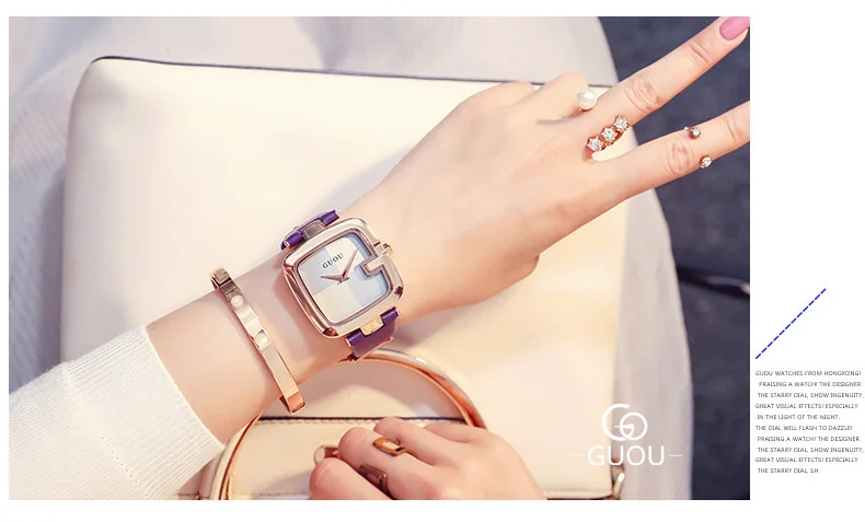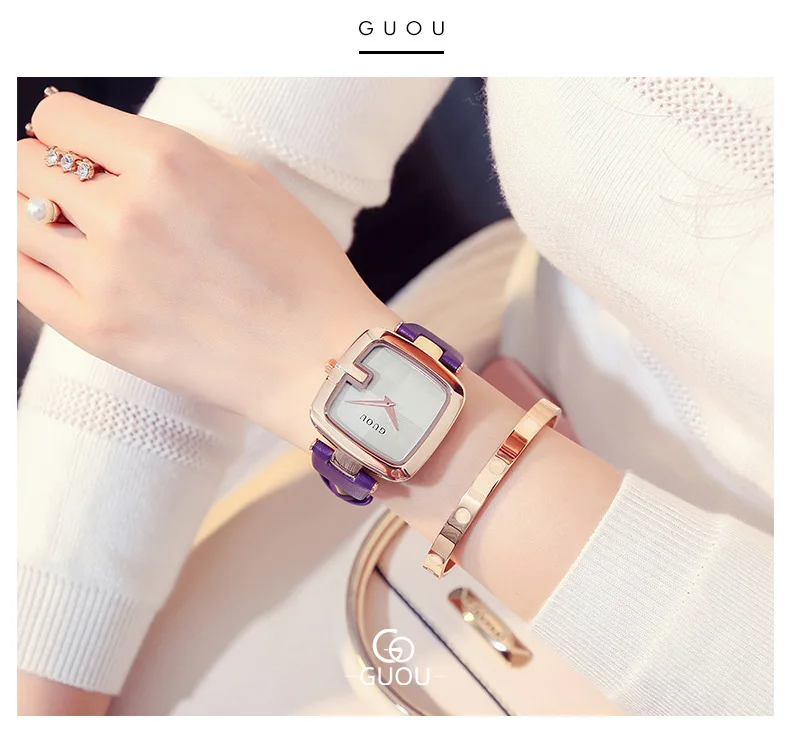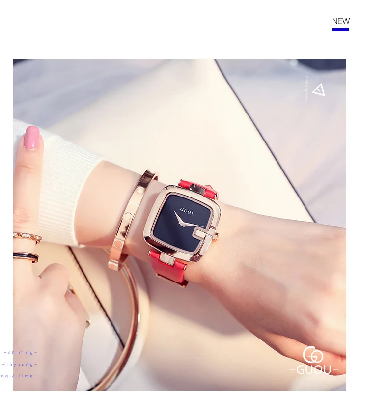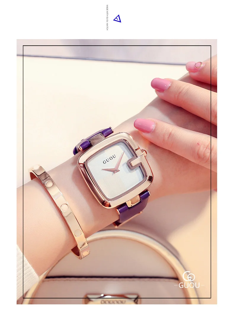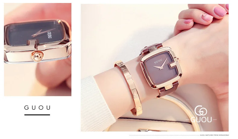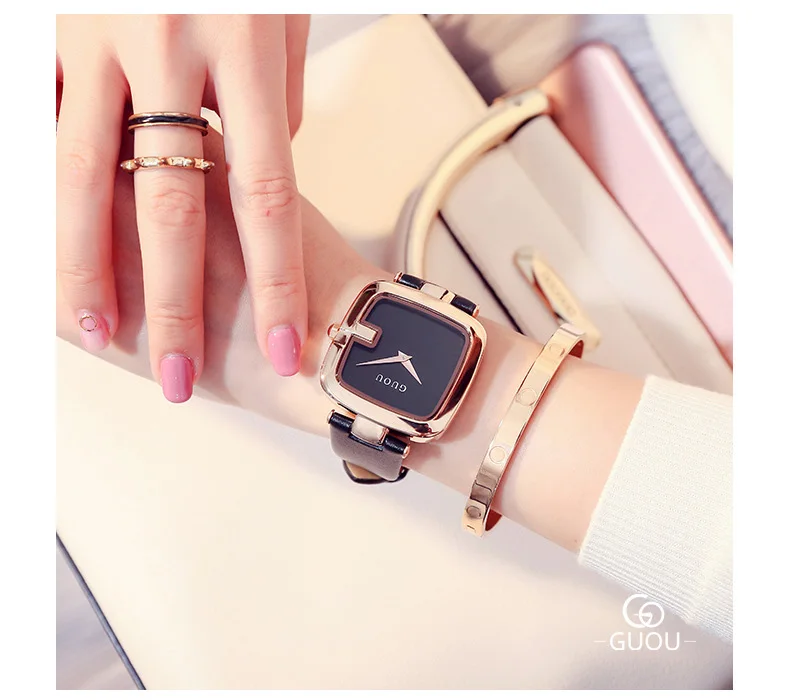 Часы GUOU женские с квадратным циферблатом, модные роскошные с кожа...