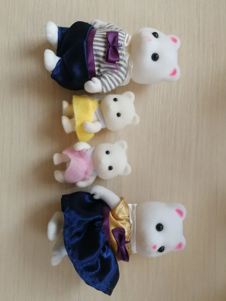 конечно же, подделка, одежка неаккуратно пошита, сзади не сходится, нитки торчат, но в общем, неплохие фигурки, ручки, ножки двигаются, можно посадить. размер гораздо меньше, чем я думала. поэтому сфотографировала в руке, линейкой не замеряла, но большие около 8-9 см в высоту, а детки3-4 см. сняла звезду за то, что продавец никак не укрепил упаковку, помялось в хлам, в коробке уже не подаришь