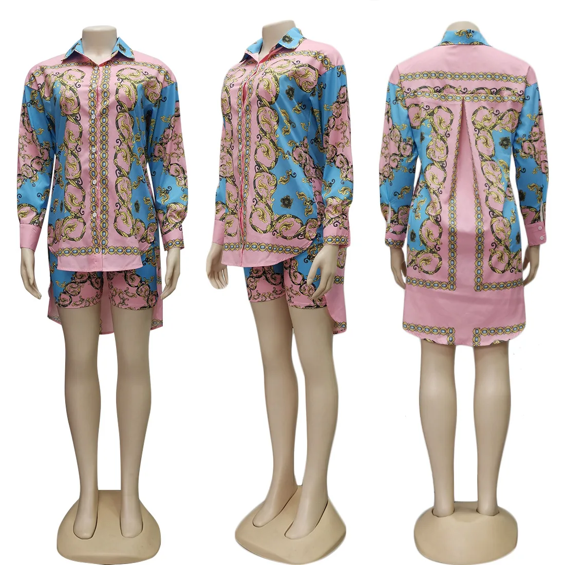 2020 New African Print Elastic Bazin Baggy Shorts Rock Style Dashiki Long Sleeve Famous Suit For Women Shirt And Shorts 2pcsse