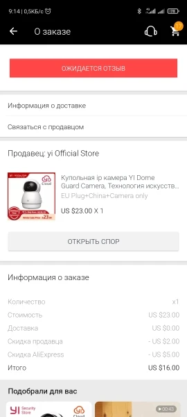 Сделал заказ на распродаже,присвоили трек. Через месяц-трек отменен,али пофигу. Написал продавцу-тишина,в итоге через 2 месяца продавец ответил-"Товара нет в наличии, можете отменить заказ, деньги вернем",хотя покупал в первый день распродажи. После высказывания всего что я думаю, продавец предложил подождать пока товар появится на складе, или купить другую модель. Договорились подождать. В итоге через месяц продавец кинул ссылку на другой лот по полной цене,сменил моему заказу цену в 1 цент, товар выслали,всё пришло нормально. В итоге через месяца 4 товар у меня. Камера неплохая, работает только в приложении YI, по сети её не видно. Умеет fullHD, ИК подсветку, следить за объектом который двигается. MicroSD, ест 64GB, пишет по движению. Просмотр через приложение, везде навязчиво предлагают купить подписку на облако, у меня пока работает без него, если стоит сд карта можно смотреть историю без облака, но нужен интернет. Комплект - камера, крепление, зарядник и шнур Micro USB.