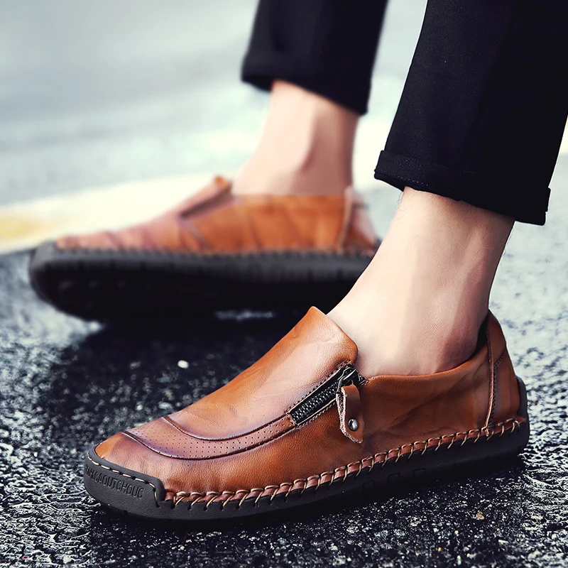 Лоферы мужские из натуральной кожи, на плоской подошве, на молнии, дышащие, коричневые, повседневные, для вождения, 38-48, лето размера плюс