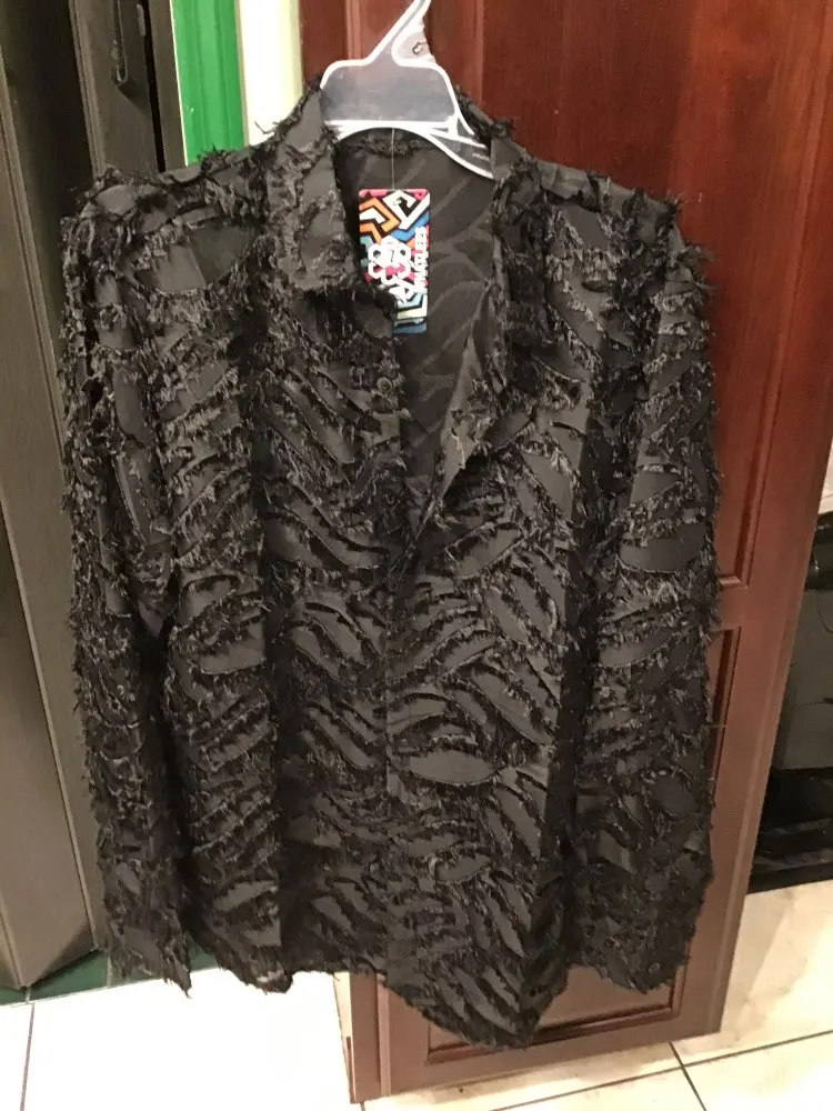 Рубашка хорошего качества, синтетика. Смотрится прикольно, на курицу похож))) Слегка прозрачная. Думаю, для сцены - то, что надо! У меня объём груди - 90 см, плечи - 45-46 см, вес 65 кг. Заказал М - немного великовата, но это лучше, чем в облипку.