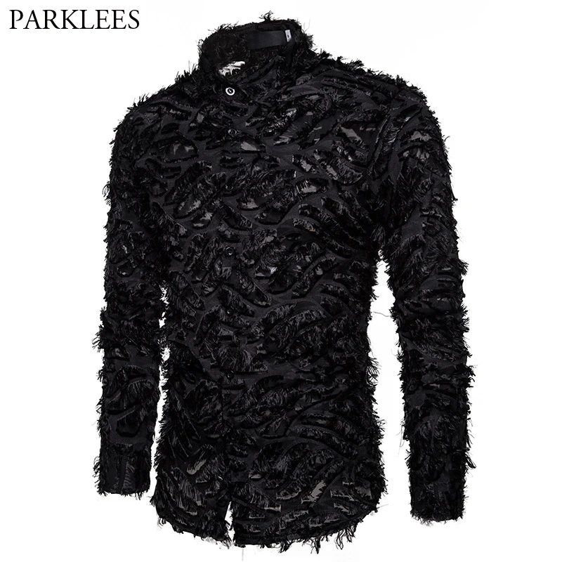 Сексуальная черная кружевная рубашка с перьями, мужская, 2020, модная Прозрачная Клубная одежда, мужские рубашки для мероприятий, вечеринок, выпускного вечера, Прозрачная сорочка, S-3XL