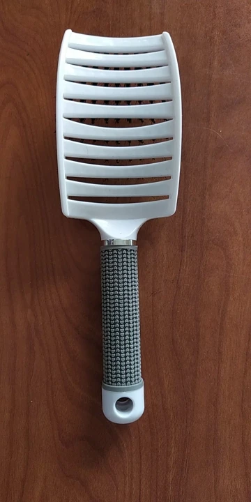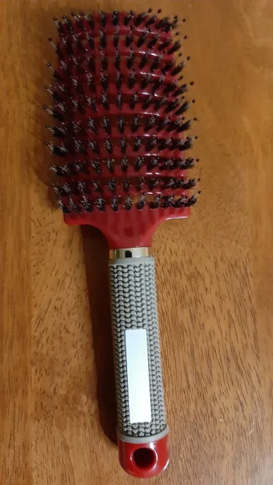 Описание: Эта нейлоновая щетина быстро сохнет и легко чистится. Резиновый руль с нескользящей конструкцией удобно держать. Можно массировать голову во время расчески.