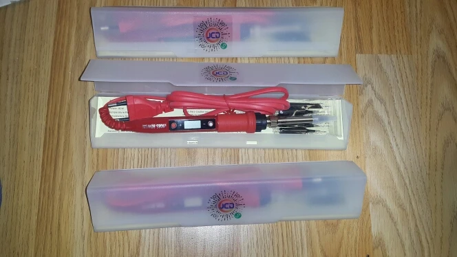 До Харькова дошло за 16 дней. Паяльник рабочий. Поработал им немного. В комплекте пять разных жал. Пластик корпуса так себе. В руке лежит удобно. Температуру на жале проверить нечем. По рекомендациям укрепил провод в корпусе. Жала на нагревателе немного люфтят, но терпимо. В общем за эти деньги неплохой вариант.