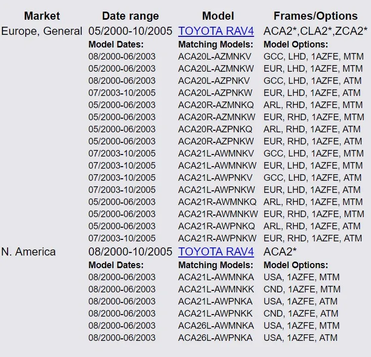 Брал комплект для toyota rav4 2001 года, все подошло, ошибок нет