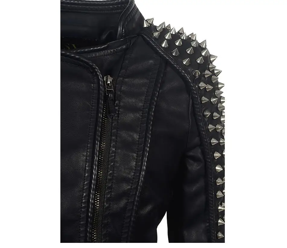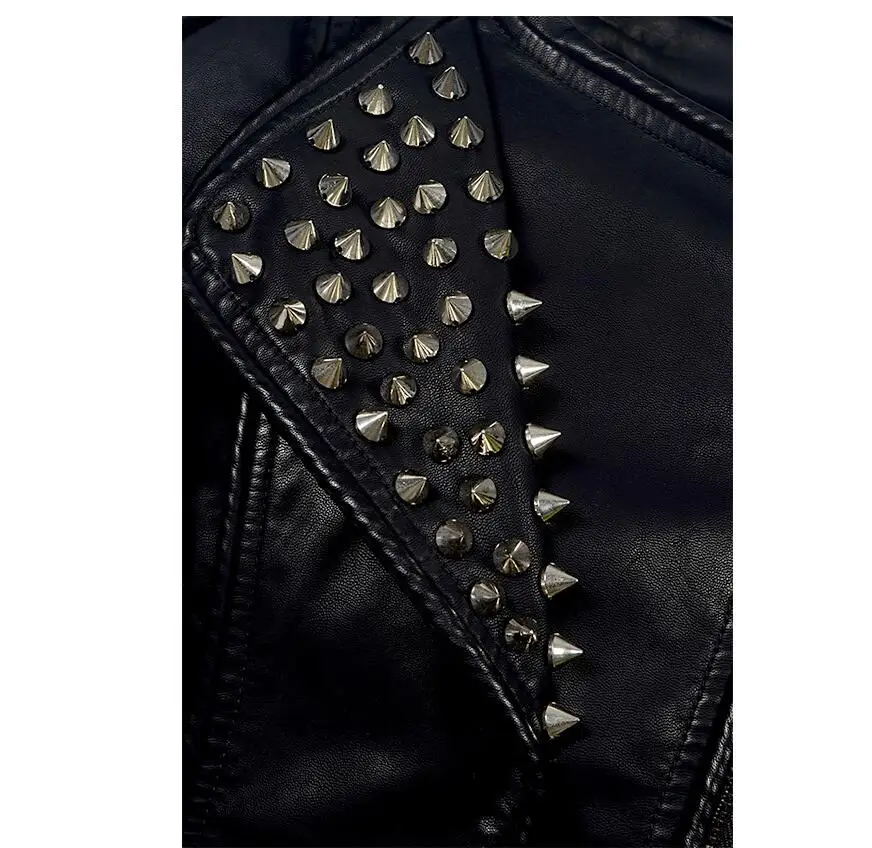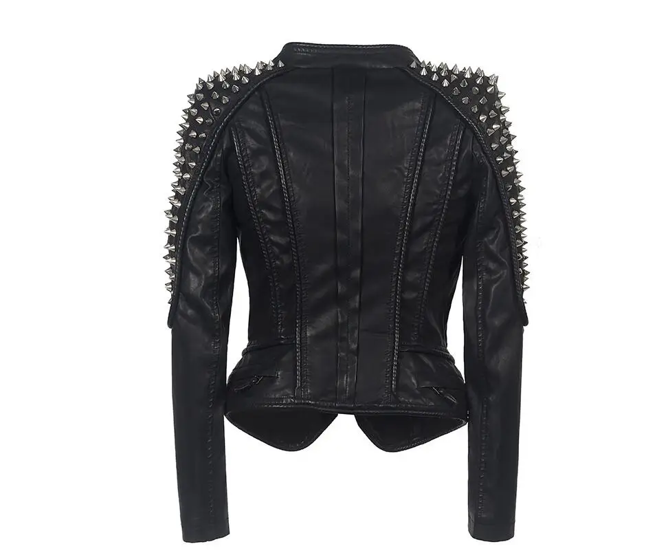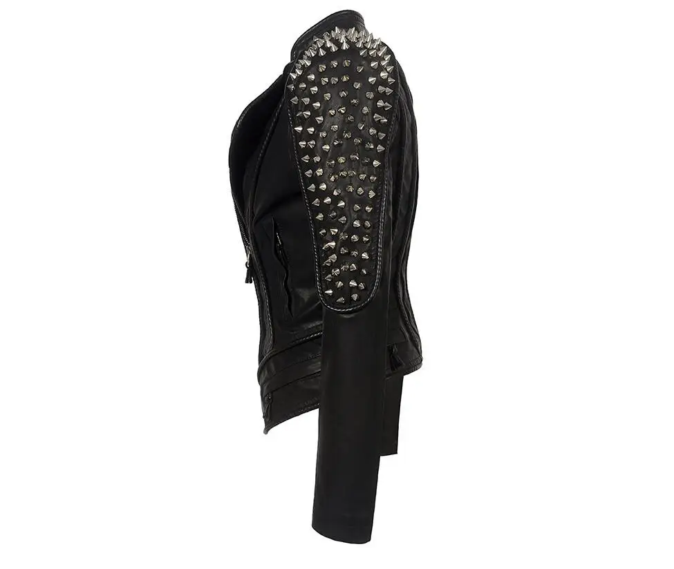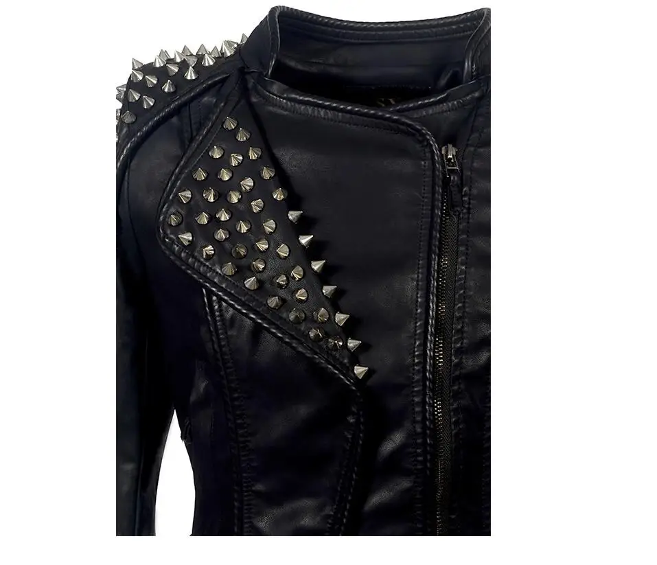 Женская кожаная куртка Новые шипы звезды тонкий Би-металл серебряные заклепки куртка металлик PU панк байкерские кожаные пальто