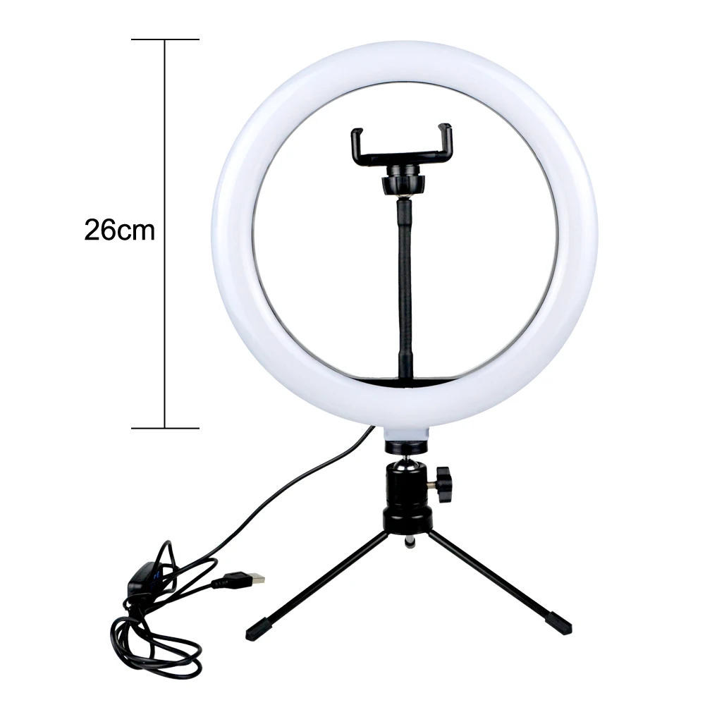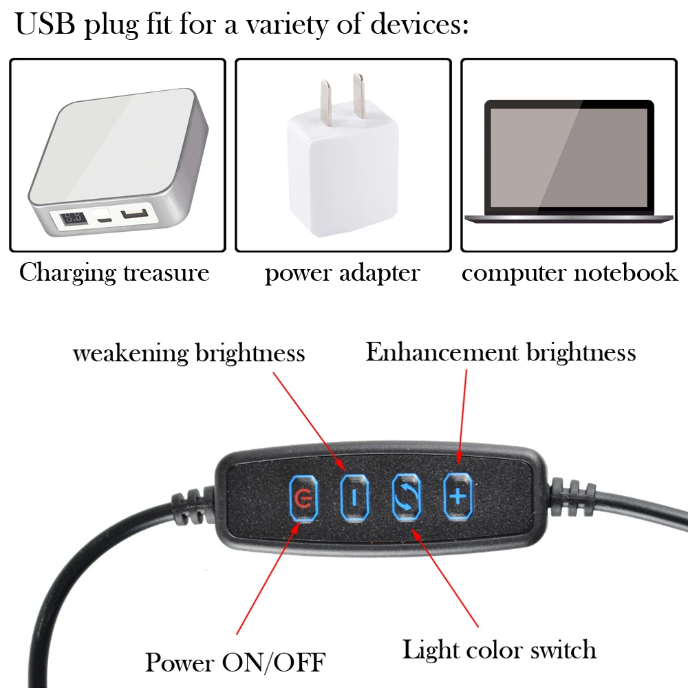 Цветовая температура: 3200K-5500K Светодиодный светильник Размеры: 16 см/26 см Количество бусин: 48/120 шт светодиодный Напряжение: 5V2A Источник питания: светильник 5 Вт Штатив Материал: металл